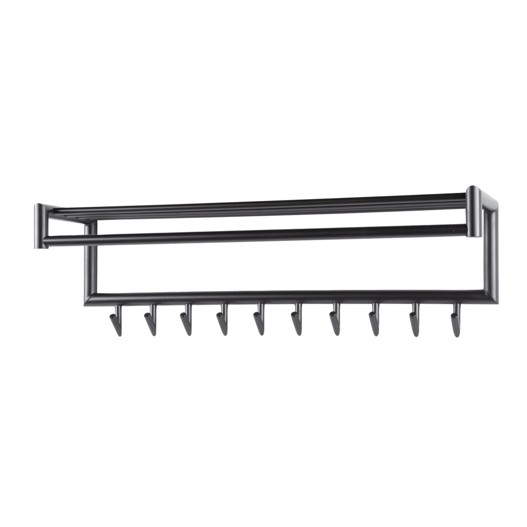 • Materiaal: Metaal • Afwerking: Mat donkergrijs • Geassembleerd: Ja • Aantal haken: 10 • Extra’s: Hoedenplank + stang voor kledinghangers • Afmetingen: L 100 × H 30 × D 27 cm