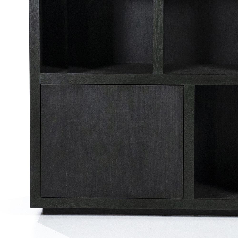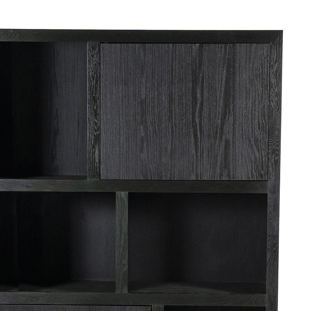 Moderne wandkast met een strakke vormgeving. Hij is gemaakt van eikenhout en van hout met een hoogwaardige eikenfineer. De kast is zwart met een matte, beschermende coating. De wandkast heeft een speelse indeling met vier vakken en twee deuren in verschillende formaten. De deuren hebben een push-to-open systeem.