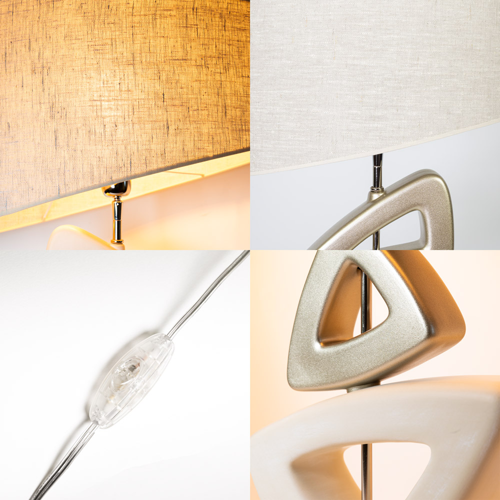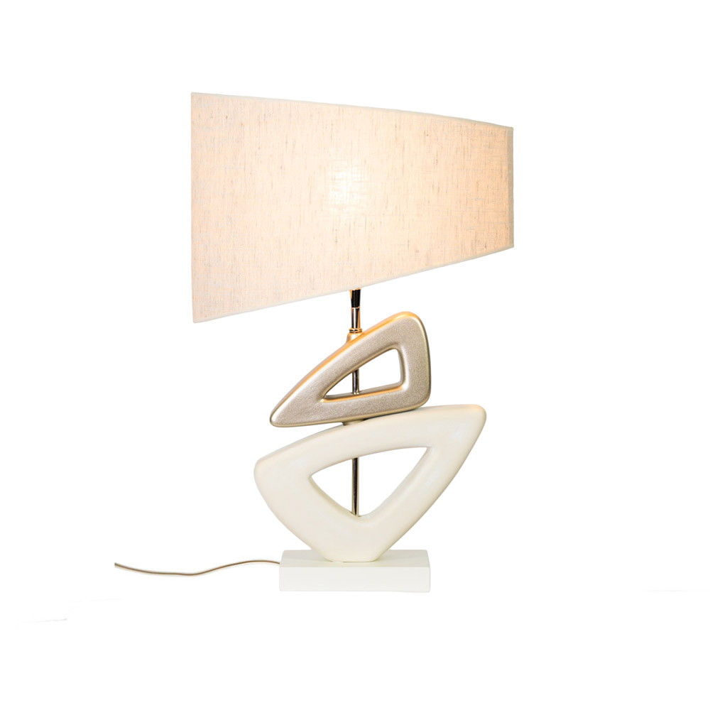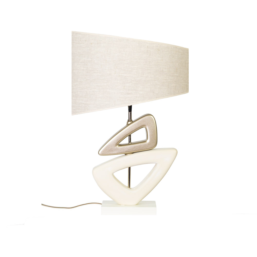 Highlights • Keramische tafellamp met sculpturale, geometrische vormen • Zachte beige- en goudtinten voor een warme uitstraling • Stoffen kap voor rustig, diffuus sfeerlicht • E27 fitting – kies zelf de lichtbron die bij je interieur past