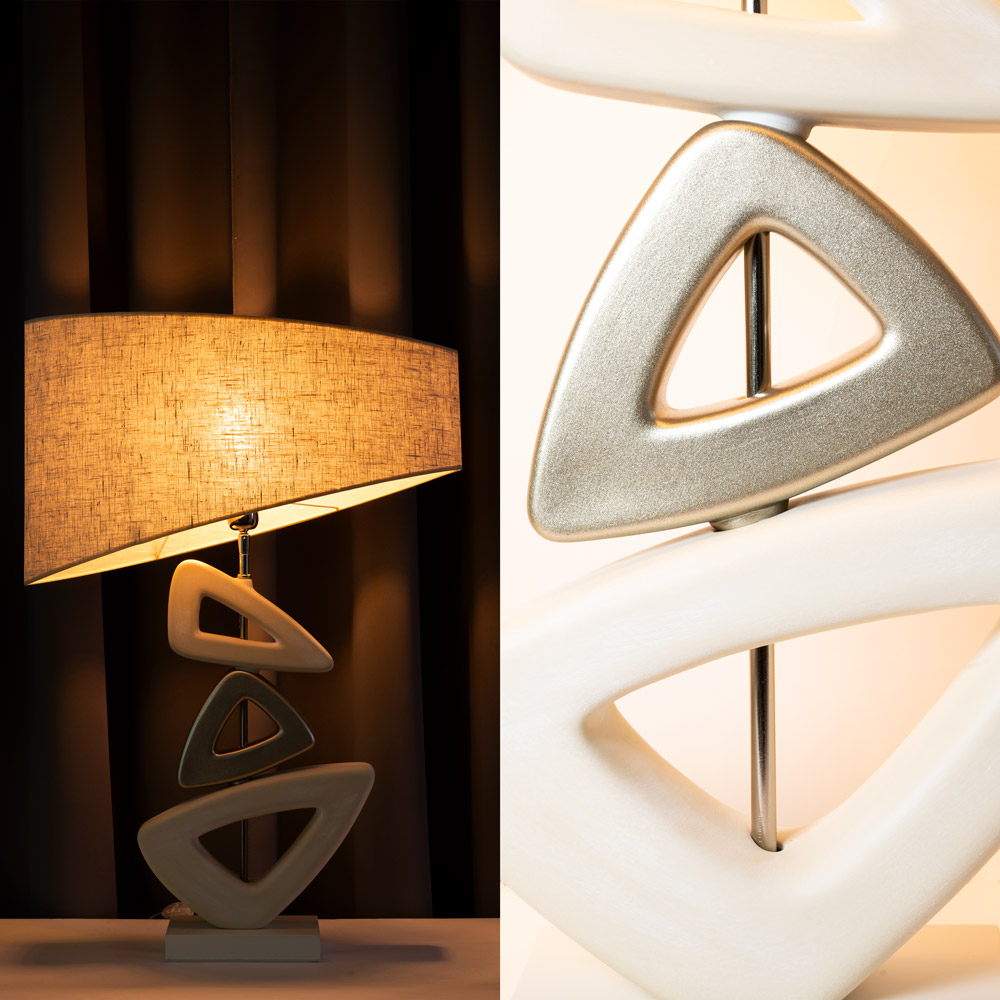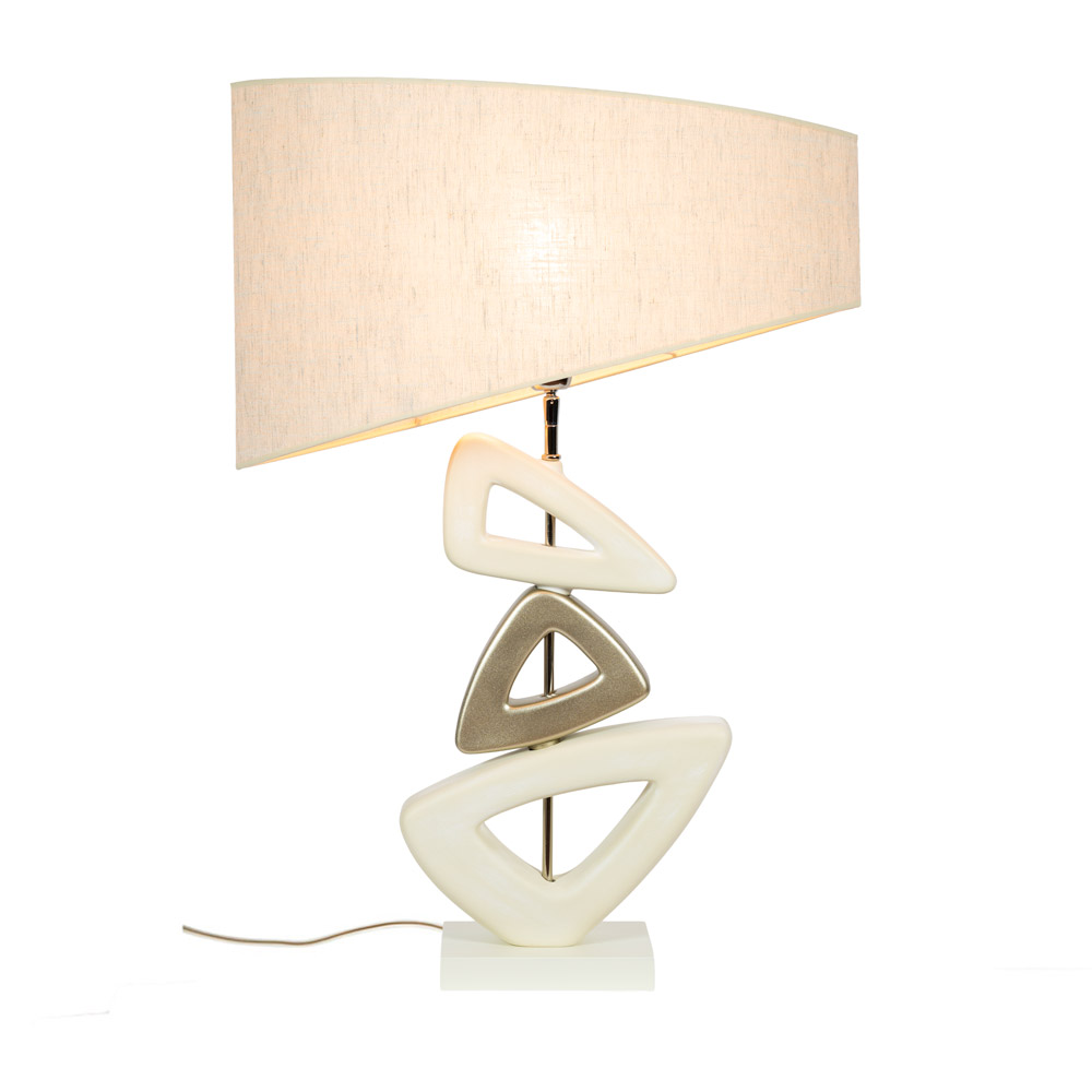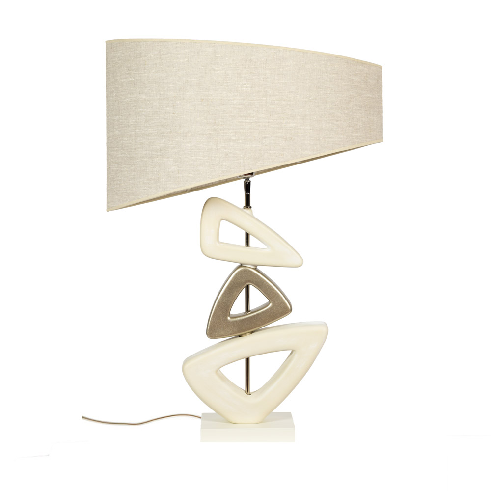 Keramische driehoek tafellamp beige/goud met stoffen kap