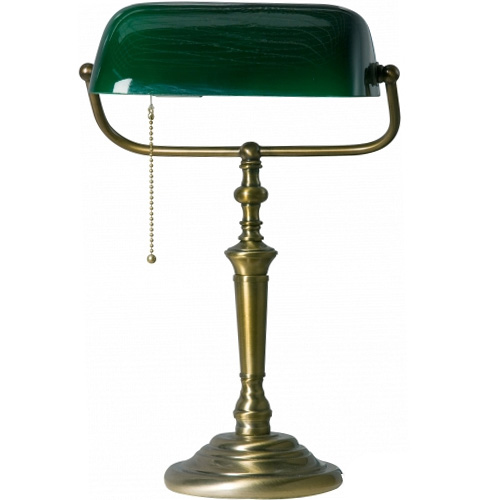 Mooie klassieke bureaulamp, ook wel de traditionele bankierslamp genoemd. Deze leeslamp is uitgevoerd in brons met donkergroen glas. Het glas is kantelbaar. Ideaal is het trekkoortje waar u de lamp mee aan-en uit kunt zetten. Zo hoef u niet te zoeken naar de schakelaar aan het snoer. Door de normale E27 fitting kunt u hier alle soorten lichtbronnen in gebruiken, van Eco Halogeen tot LED lampen.