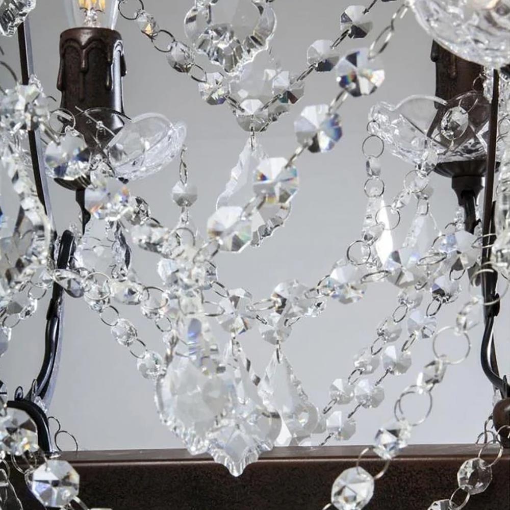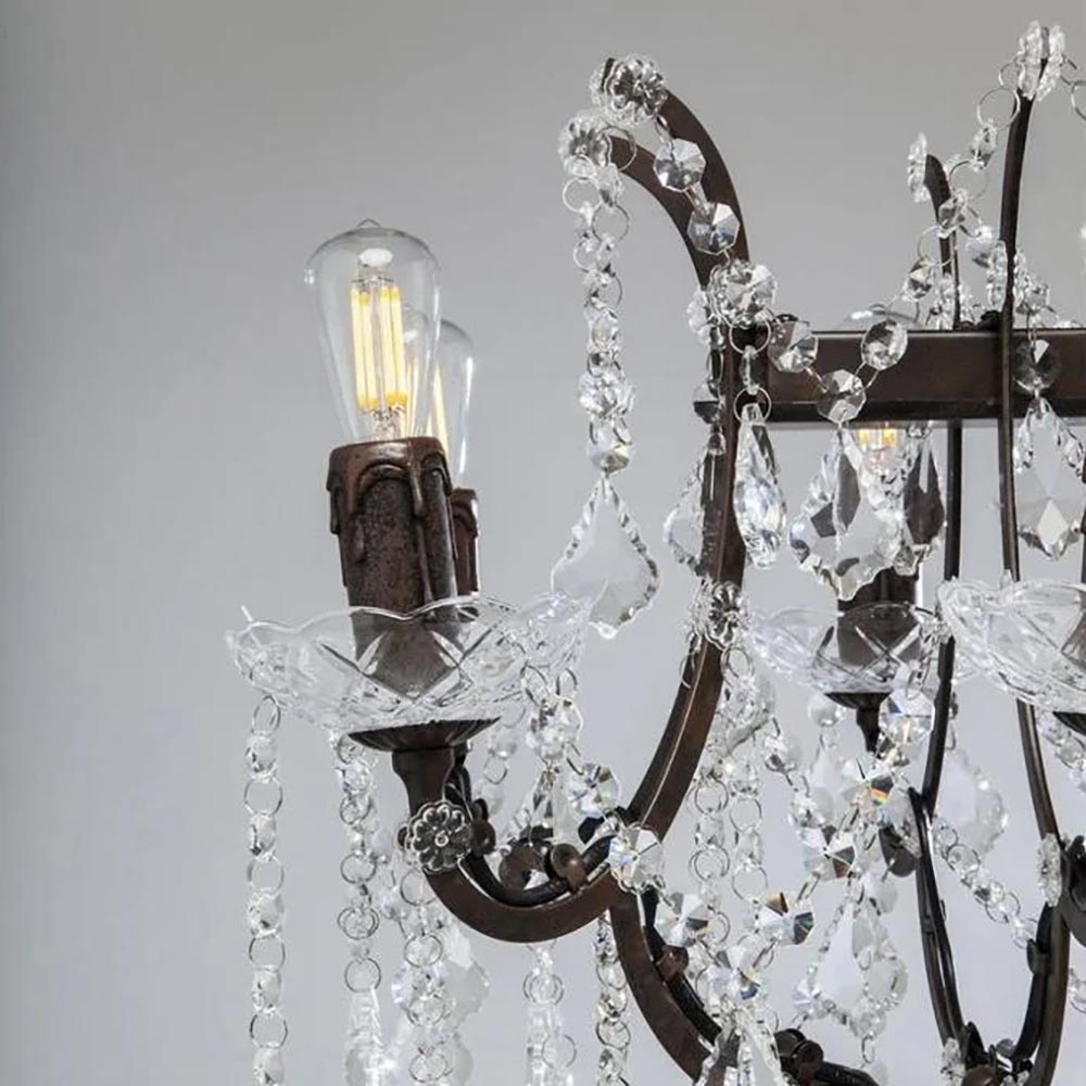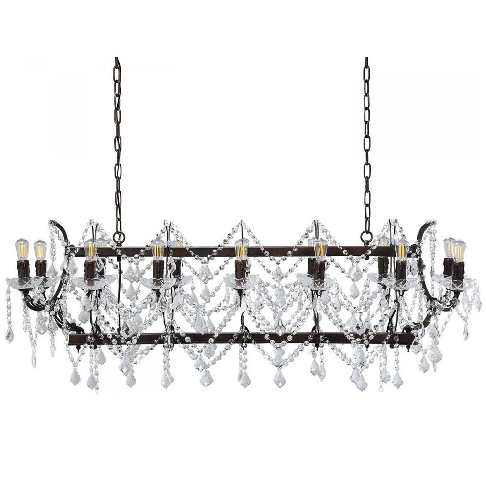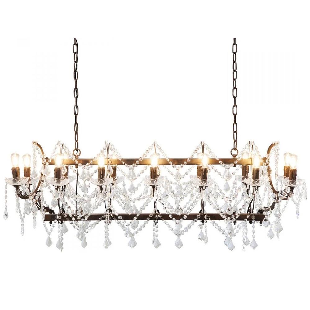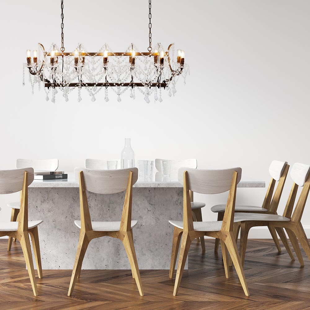 Een mooie eye-catcher voor boven een eettafel. Deze klassieke hanglamp bestaat uit een metalen frame waar 14 lichtpunten op zijn verwerkt. De lamp doet denken aan een kroonluchter en is ook op dezelfde wijze versiert met kristalglas. De kristallen pegels zijn verbonden met kleine ringetjes die samen een ketting vormen. De lichtpunten hebben een koper, roest-achtige kleur en zijn afgewerkt met glazen schoteltjes. De grote hanglamp hangt aan twee stevige kettingen die naar wens zijn in te korten. De klassieke lamp wordt met een kleine plafondbalk opgehangen in dezelfde kleur als de ketting en het armatuur. De hanglamp is een mooie nieuwe vertaling van de klassieke kroonluchter.
