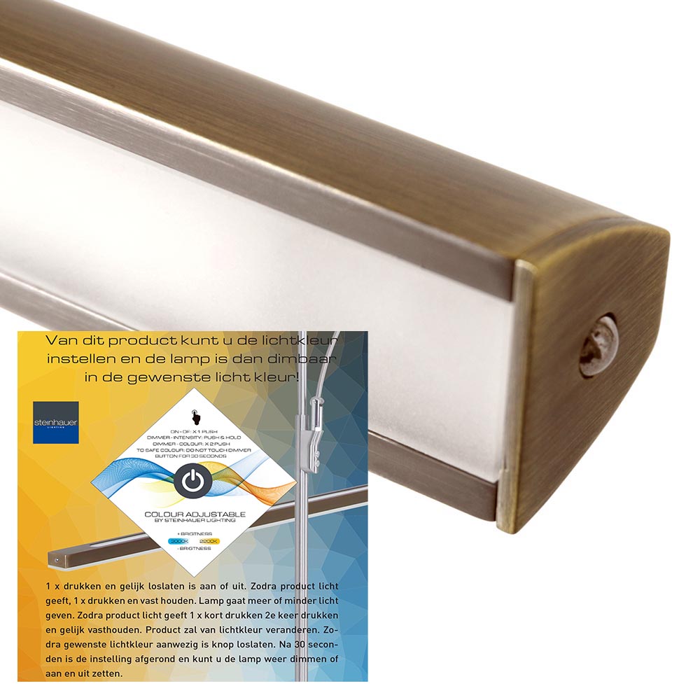 Deze klassieke schilderij wandlamp is voorzien van een modern snufje. De wandlamp is voorzien van LED verlichting en gemakkelijk te bedienen door middel van een pushdimmer met diverse functies. Drukt u éénmaal dan gaat de lamp aan of uit, drukt u éénmaal en houdt u de knop ingedrukt, dan dimt de lamp in intensiteit, drukt u tweemaal dan kunt u veranderen in kleurtemperatuur. De kleur wordt onthouden wanneer u de pushdimmer 5 seconden ingedrukt houdt. Zo creëert u gemakkelijk en snel de juiste sfeer en beste verlichting voor boven uw schilderij, mede doordat de kap is te kantelen. De bronzen wandlamp wordt geleverd inclusief zwart snoer van 170 cm.