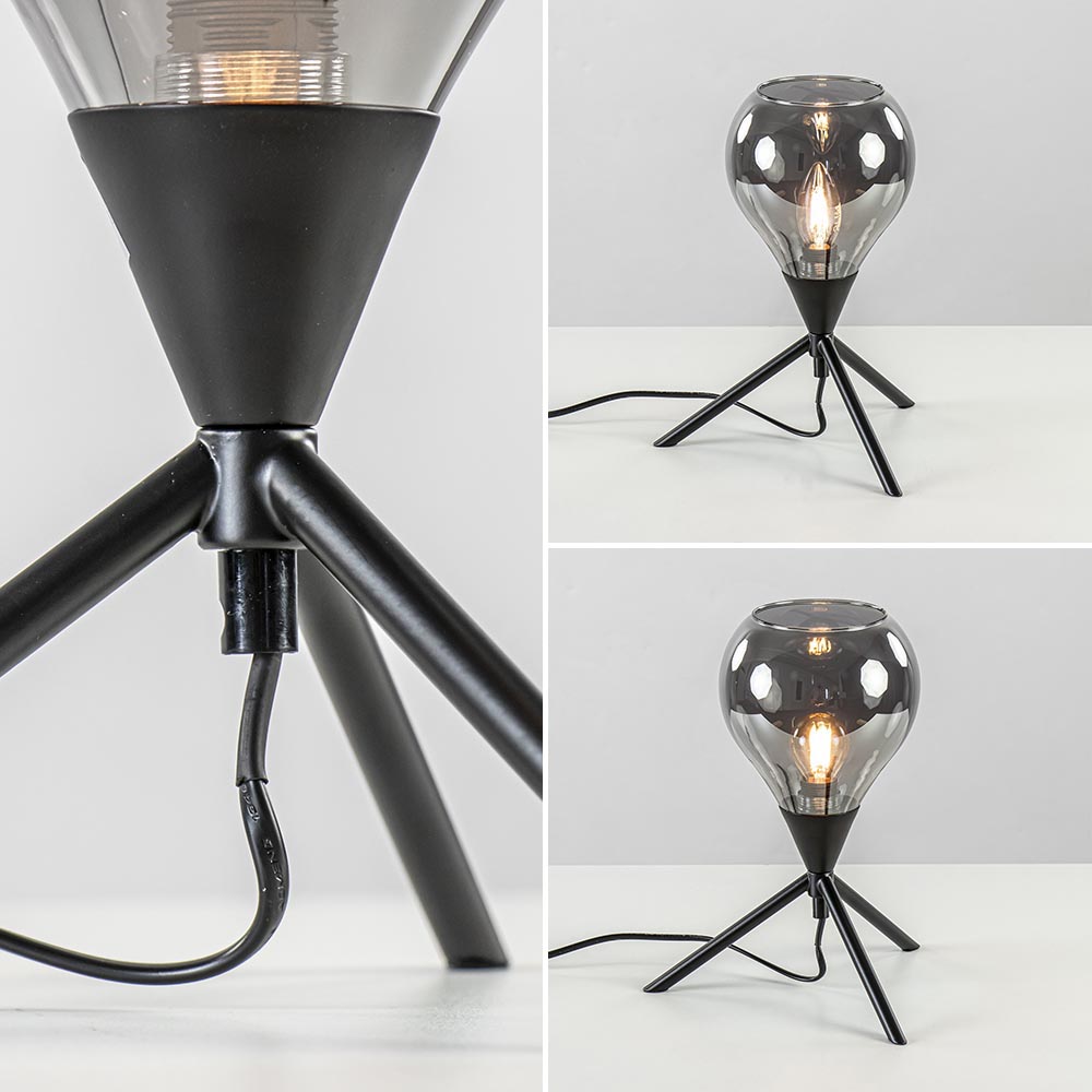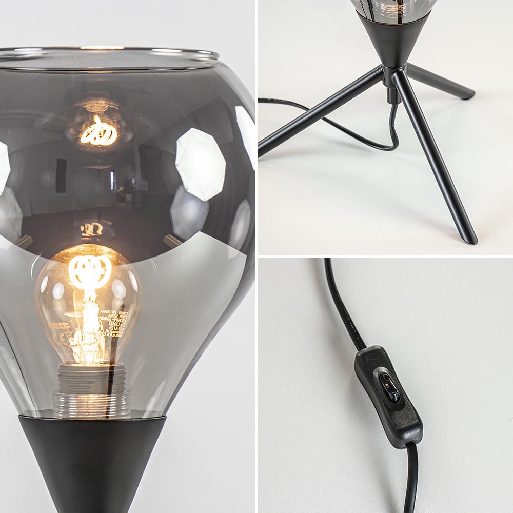– hoogte: 29 cm – driepoot: Ø23×14,5 cm – kap: Ø15×14,5 cm – smoke/titanium glas – metaal, zwart – zwart snoer: 180 cm – exclusief lichtbron (E14)
