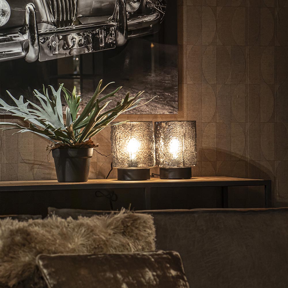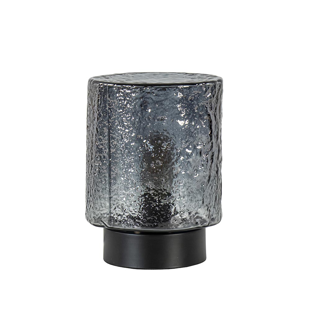 Deze trendy tafellamp is een sfeervolle toevoeging aan het interieur. De tafellamp is voorzien van een grove glazen kap met reliëf die mat is uitgevoerd. Deze is met de hand gemaakt waardoor iedere kap uniek is. De smoke glazen kap wordt ondersteund door een zwart metalen voet met een snoer van 175 cm. De glazen tafellamp past mooi op een dressoir, kast of het nachtkastje.