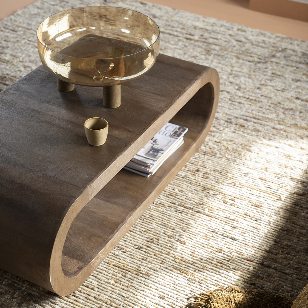 De “Elora” koffietafel combineert een opvallend, organisch gevormd frame met de warme uitstraling van mangohout—een stoer én sfeervol middelpunt voor je zithoek.