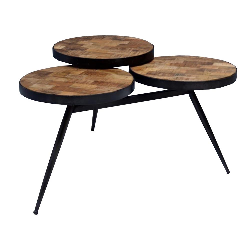 Unieke salontafel met mangohouten bladen. De salontafel bestaat uit 3 in elkaar overlopende cirkels op verschillende verdiepingen. De tafelbladen hebben een natuurlijk houten uitstraling. De salontafel heeft een mat zwart metalen frame.