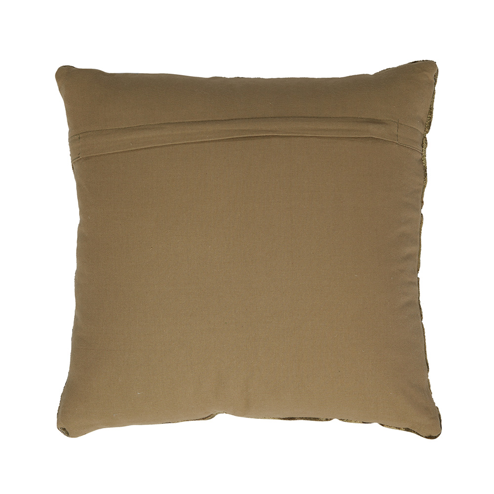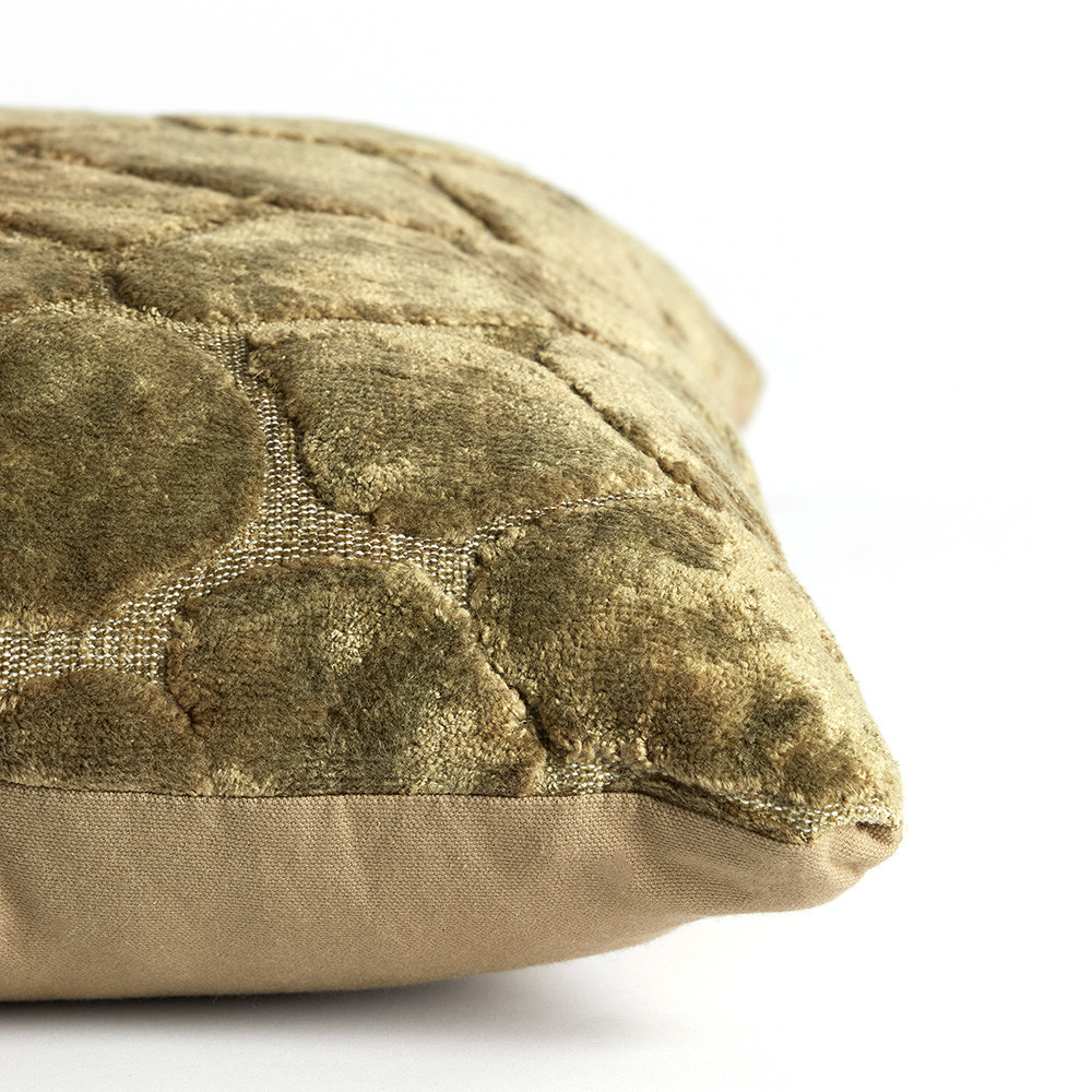 Dit prachtige kussen met een afmeting van 45×45 cm heeft een subtiele, luxueuze uitstraling dankzij het zachte, olijf groene fluweel dat in een uniek patroon is geweven. Het ontwerp bestaat uit een herhalend geometrisch motief met een lichte structuur, wat zorgt voor zowel elegantie als comfort. Het kussen is voorzien van een verborgen rits aan de achterkant, wat zorgt voor een naadloze afwerking. Dit kussen is perfect voor het toevoegen van een stijlvolle, rustgevende sfeer in je woonkamer of slaapkamer en combineert elegantie met comfort.
