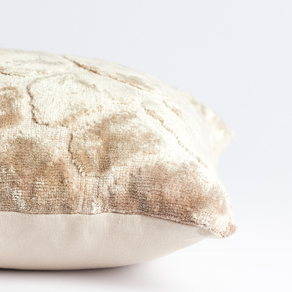 Dit prachtige kussen met een afmeting van 60×30 cm heeft een subtiele, luxueuze uitstraling dankzij het zachte, beige fluweel dat in een uniek patroon is geweven. Het ontwerp bestaat uit een herhalend geometrisch motief met een lichte structuur, wat zorgt voor zowel elegantie als comfort. Het kussen is voorzien van een verborgen rits aan de achterkant, wat zorgt voor een naadloze afwerking. Dit kussen is perfect voor het toevoegen van een stijlvolle, rustgevende sfeer in je woonkamer of slaapkamer en combineert elegantie met comfort.