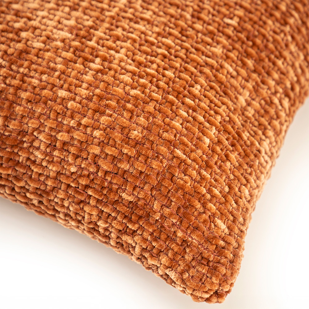 Het “Hyde” kussen in terracotta zorgt voor een warm accent dankzij de rijke, chenille-achtige pool en subtiele lusstructuur.