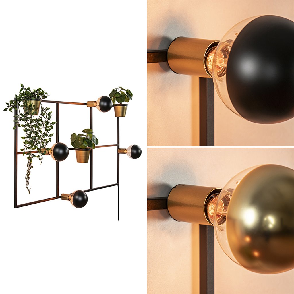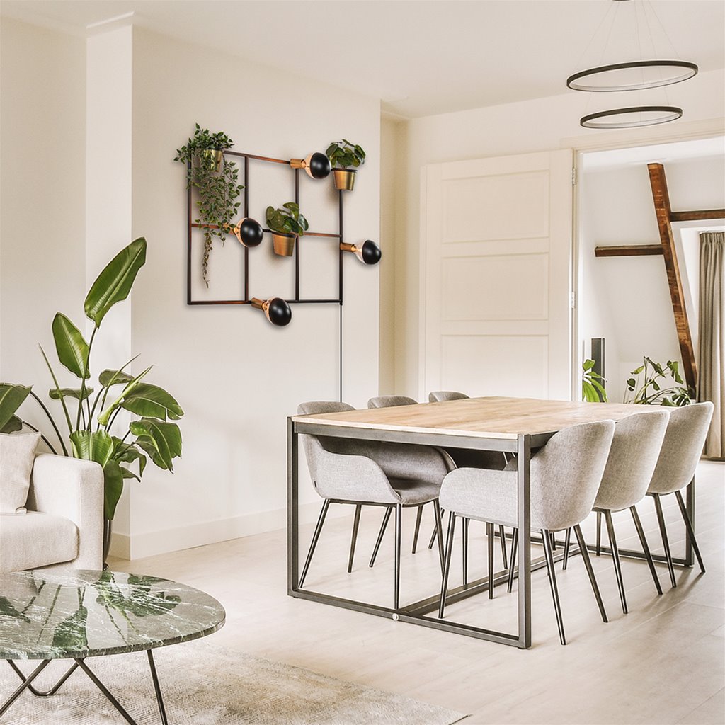 Beschrijving Rechthoekig wandrek met plantenpotten en E27 fittingen