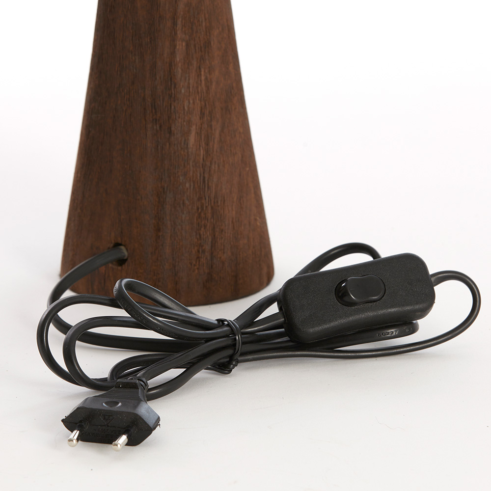 Deze lampvoet heeft een verfijnde en elegante uitstraling met een eigentijds ontwerp. Gemaakt van donker hout, biedt de slanke, conische vorm een modern contrast met de natuurlijke textuur van het materiaal. De houten voet heeft een rijke, warme tint die een luxe uitstraling geeft aan je interieur. Het ontwerp is minimalistisch, met een subtiele ronding aan de bovenkant die overgaat in een stevige voet. Het is de perfecte basis voor een lampenkap, ideaal voor het creëren van een sfeervol accent in je woonkamer, slaapkamer of studeerkamer. De voet is voorzien van een snoer met schakelaar voor extra gebruiksgemak.