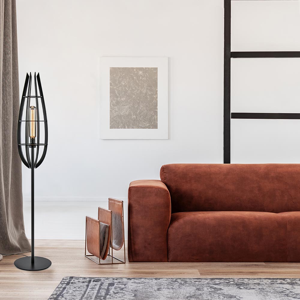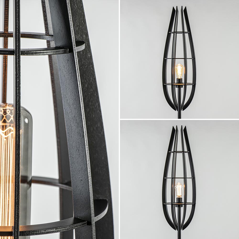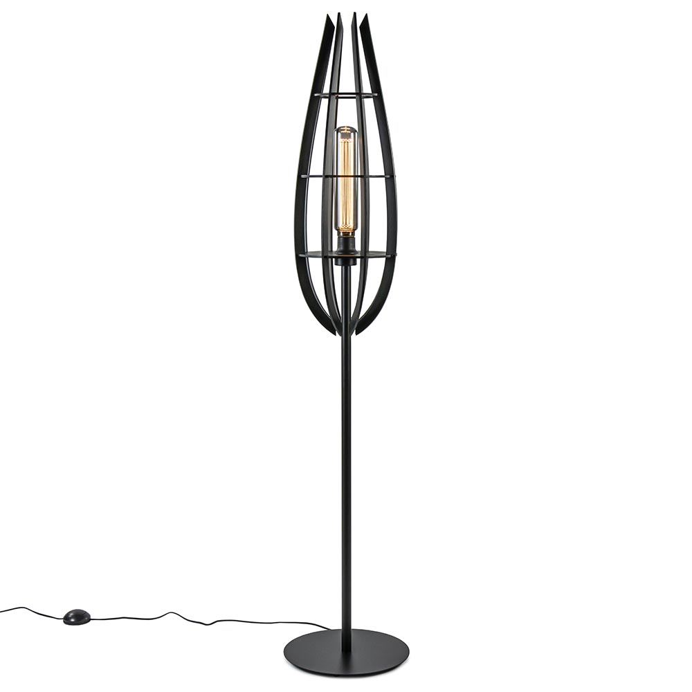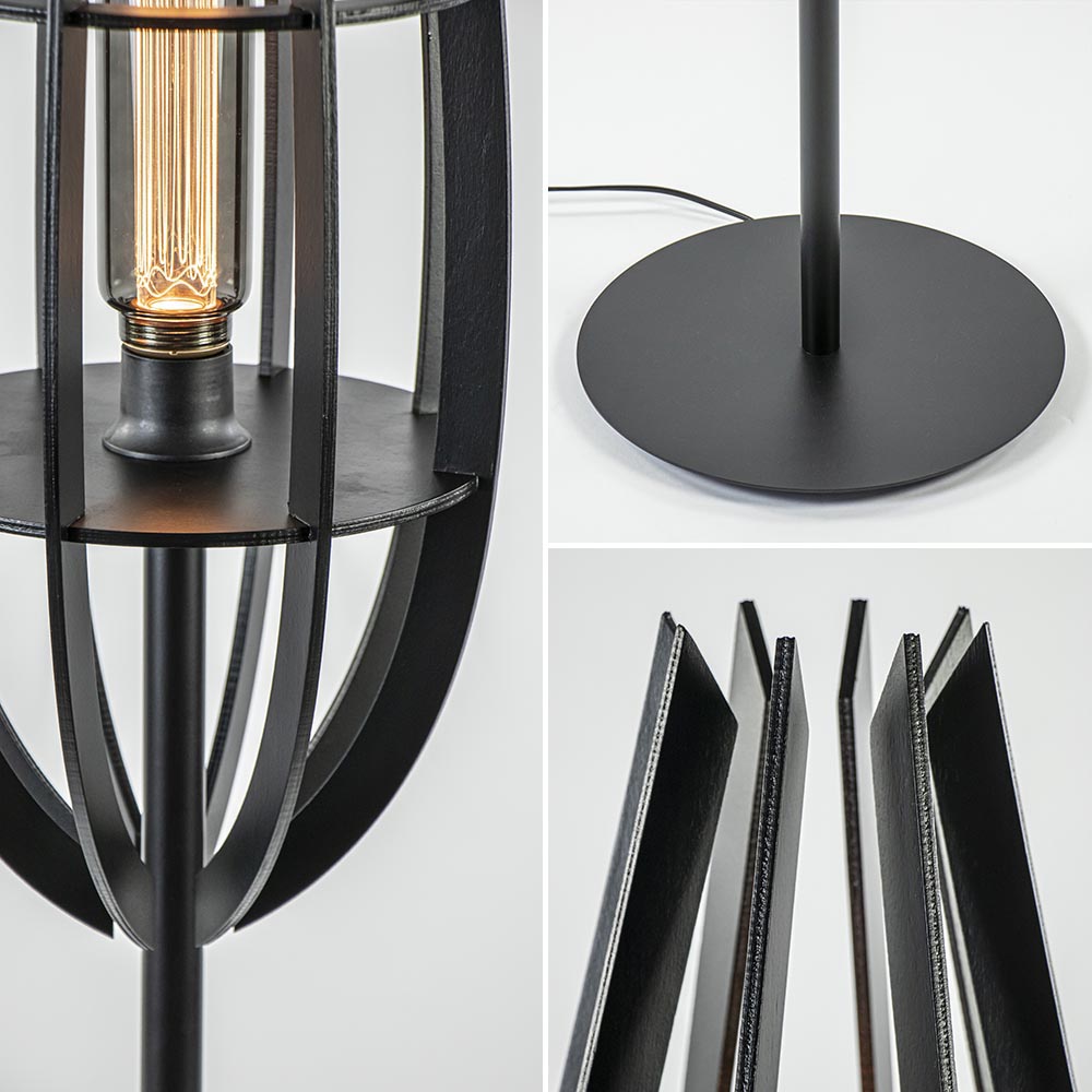 Een mooie toevoeging voor diverse interieurstijlen. De vloerlamp is door het kleurgebruik ideaal te combineren. De lamp heeft een metalen armatuur dat is uitgevoerd in het mat zwart en een houten kap eveneens in een mat zwarte uitveoring. Perfect voor een Scandinavische en landelijke woonstijl. De houten kap bestaat uit losse lamellen die door de horizontale ringen worden ondersteund. De onderste ring sluit mooi aan op de fitting waardoor er ruimte is om een decoratieve XL lichtbron te plaatsen. De ronde voet is voorzien van een zwart snoer met een lengte van 225 cm, met een schakelaar op 75 cm van voet.