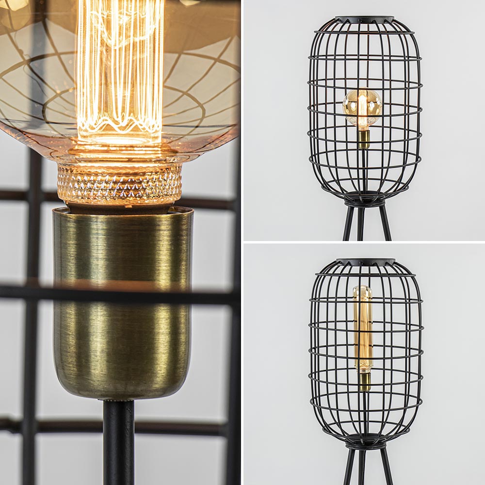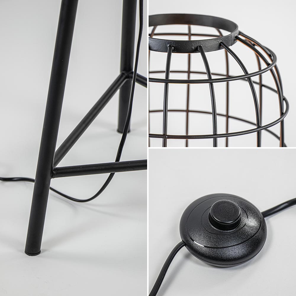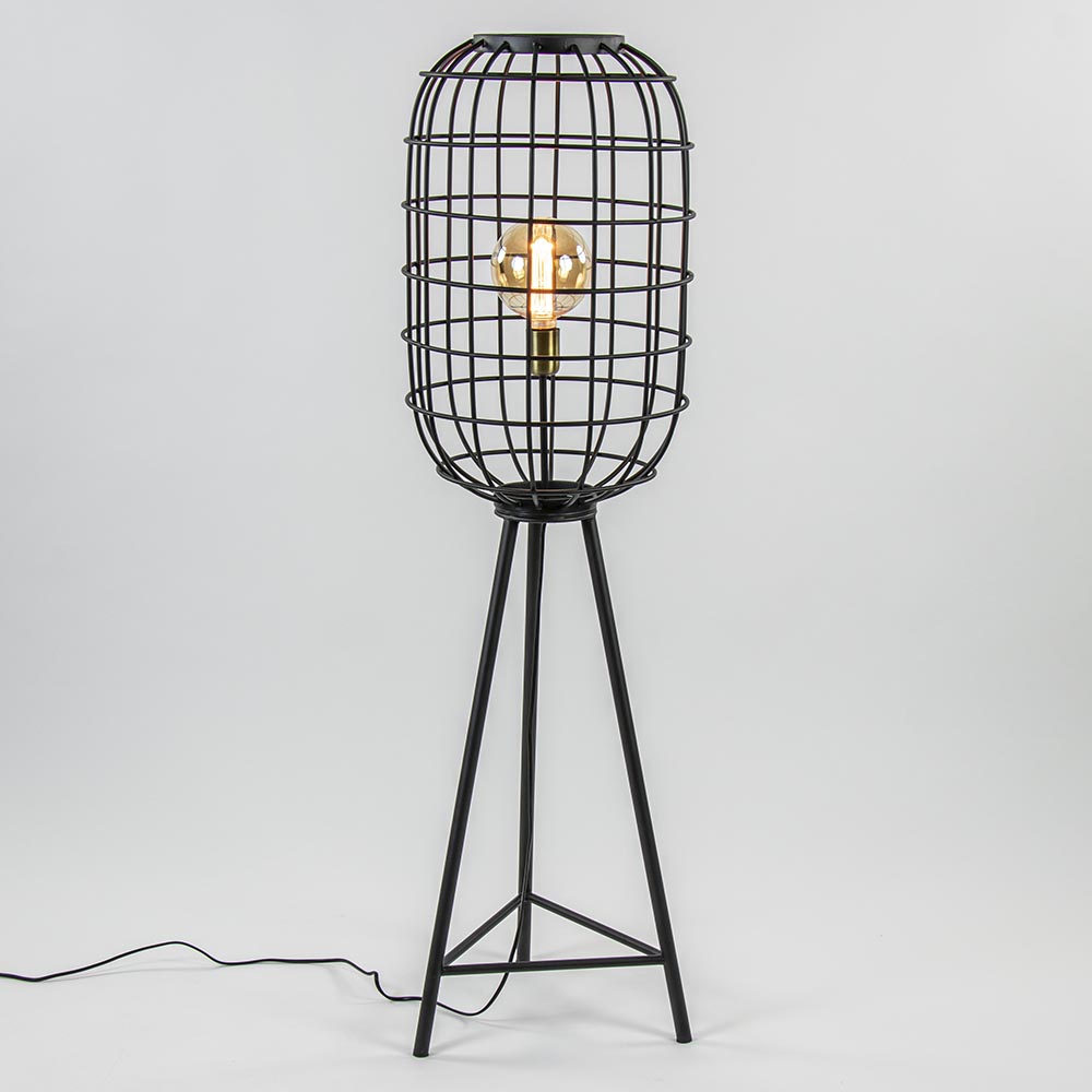 Een stoere vloerlamp die mooi is toe te passen in diverse woonstijlen als landelijk of industrieel. De driepoot vloerlamp is volledig van metaal en voorzien van een grote kooi als kap. Binnenin de kooi bevindt zich een bronzen E27 fitting. Door de hoogte van de kooi kan er gebruik worden gemaakt van een grote decoratieve lichtbron. Vloerlamp Toah heeft een zwart snoer met een lengte van 330 cm en een voetschakelaar op 200 cm.