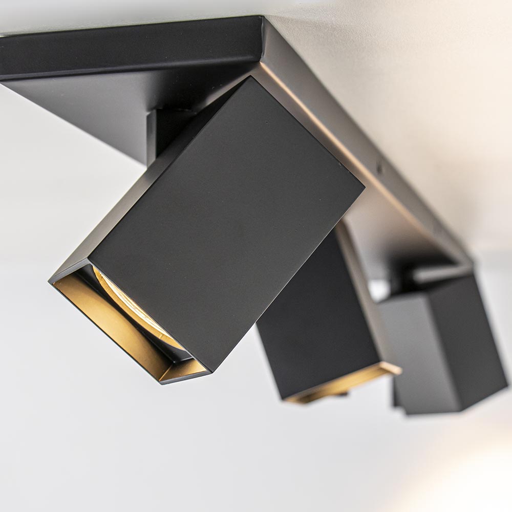 Strak van design en functioneel in gebruik. Deze vierkante opbouwspot is een unieke in zijn soort. Veelal zijn de spots rond maar deze is uitgevoerd in het vierkant/rechthoekig. De spots hebben een afmeting van 5,5×5,5 cm en is 8,5 cm hoog. De spots zijn bevestigd op een smal pootje. De rechthoekige spots kunnen kantelen en het pootje kan draaien. Zo kunt u de 3-lichts plafondlamp helemaal naar wens stellen. Ideaal voor in een hal of slaapkamer. De langwerpige opbouwspot is volledig gemaakt van metaal en voorzien van een mat zwarte finish. De plafondspot is dimbaar middels een externe dimmer (exclusief) en wordt geleverd exclusief lichtbronnen.