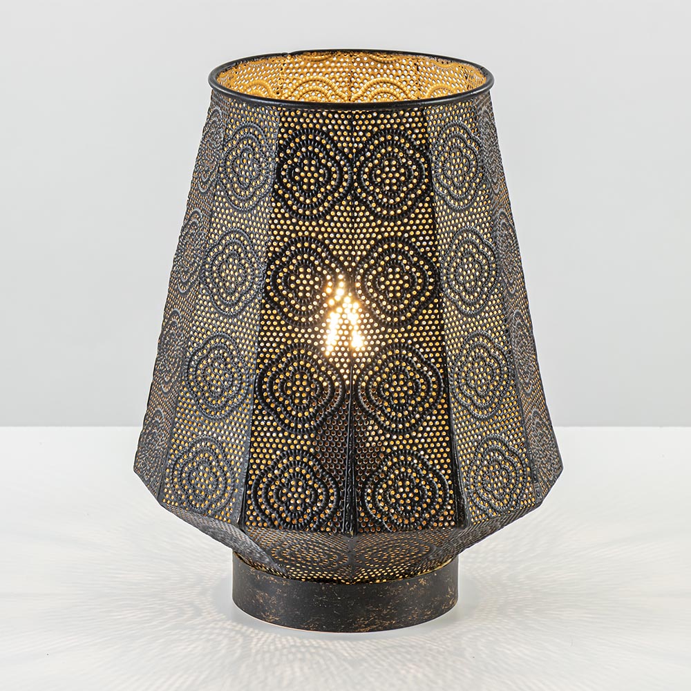 Sfeervol op een dressoir, kast of bijzettafel. Deze lantaarn tafellamp brengt een beetje Oosterse sfeer in huis. De tafellamp is volledig gemaakt van metaal en voorzien van een decoratief dessin welke nog meer opvalt wanneer de lamp wordt ingeschakeld. Het metaal is verder geperforeerd zodat deze voldoende licht kan doorlaten maar er niet direct in de lichtbron kan worden gekeken. De Oosterse tafellamp is uitgevoerd in het donker bruin en heeft een antieke afwerking wat de lantaarn een doorleefde look geeft. De binnenzijde van de kap is goud-kleurig wat zorgt voor een extra warme verlichting. De donker bruine tafellamp met dessin heeft een zwart snoer van 180 cm met een knipschakelaar op 30 cm van de lamp en wordt zonder lichtbron (E27) geleverd.