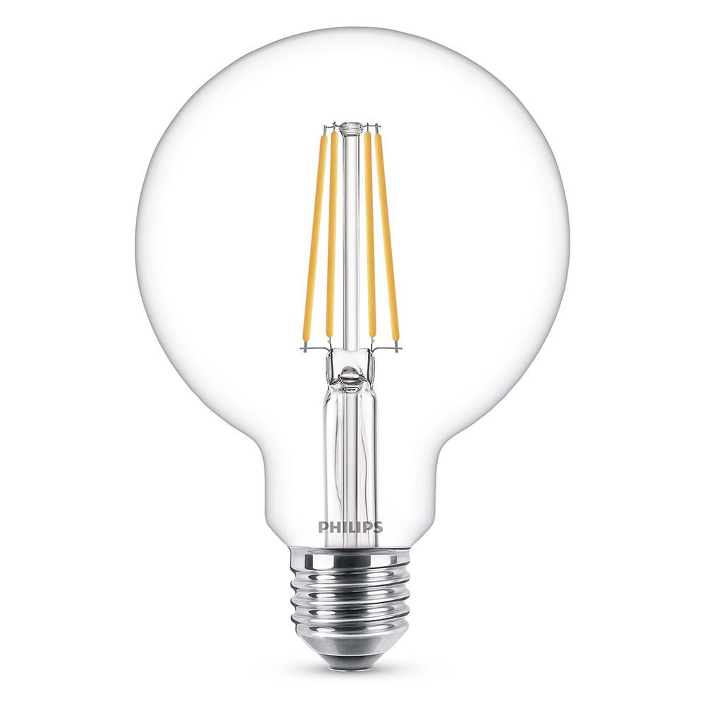 – 9W lichtbron (geeft licht als een 60W gloeilamp) – warm wit van kleur – grote bol Ø 95 mm en 150 mm hoog – dimbaar met de juiste LED dimmer – 806 lumen – 2700 kelvin