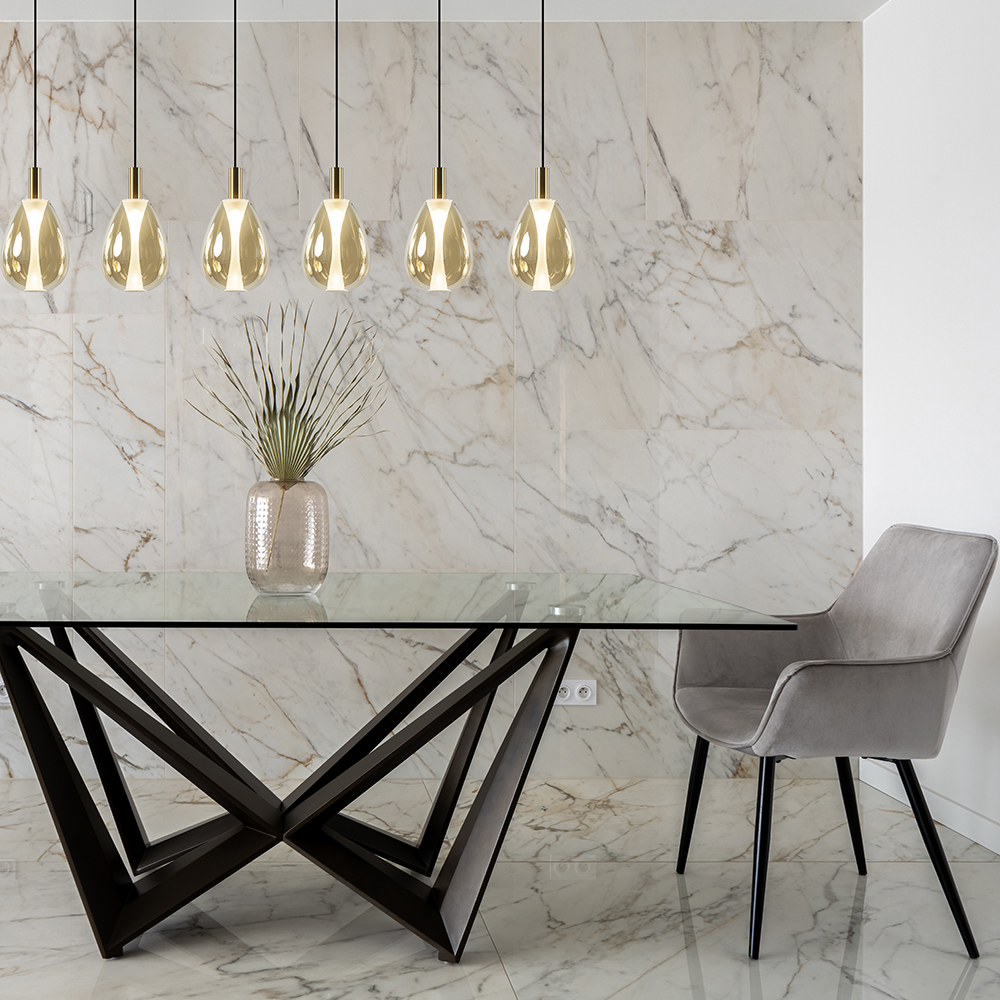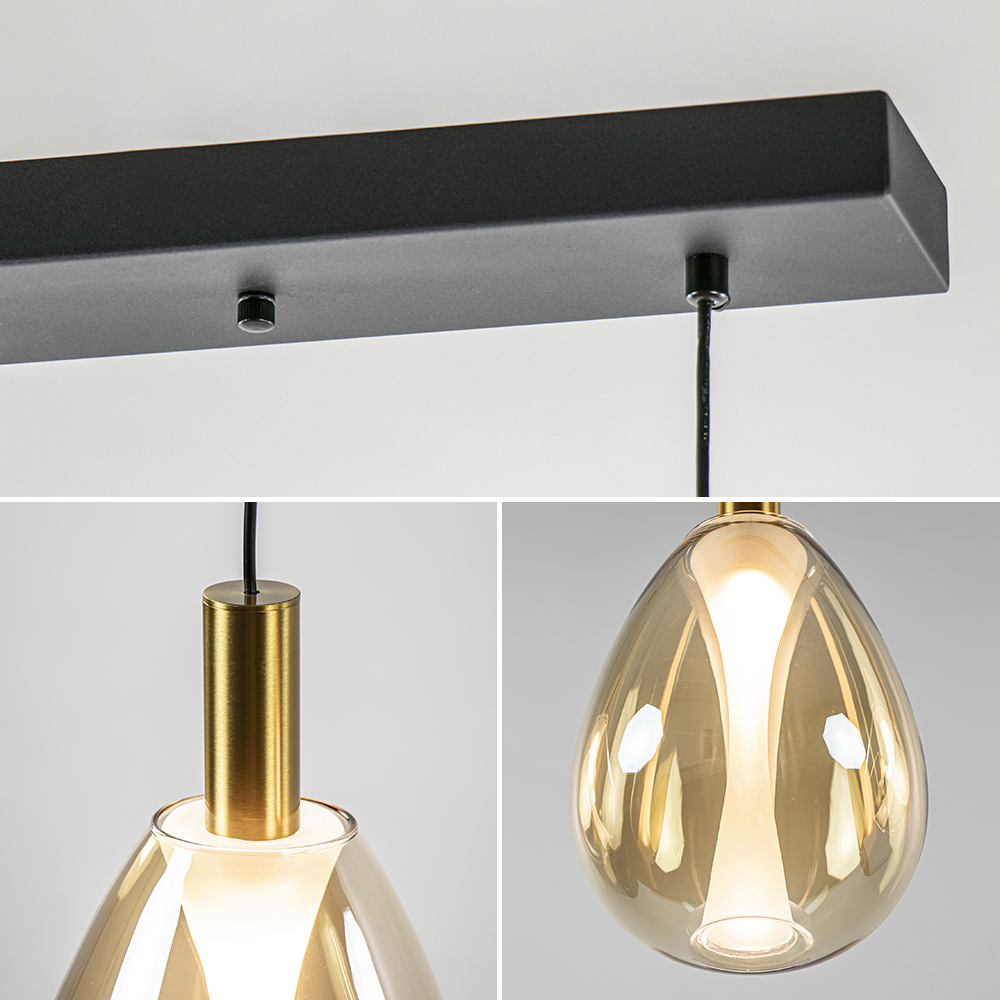 Een strak klassieke hanglamp met een hotel chic uitstraling. De hanglamp heeft een mat zwart bevestiging die is gecombineerd met amber glazen kappen en bronzen details. Dit geeft de lamp echt die luxe chique uitstraling. Dit wordt versterkt door het matte binnenglas dat oplicht wanneer de lamp wordt ingeschakeld. Zo onstaat er een mooi effect in het glas. De strak klassieke hanglamp is voorzien van geïntegreerd LED en geeft met 2700 Kelvin een fijne en sfeervolle warm witte verlichting. Dit is dimbaar middels een externe dimmer (exclusief). Een elegante toevoeging aan de eetkamer. Hang de kappen op een lijn of laat ze verspringen voor een speels effect.