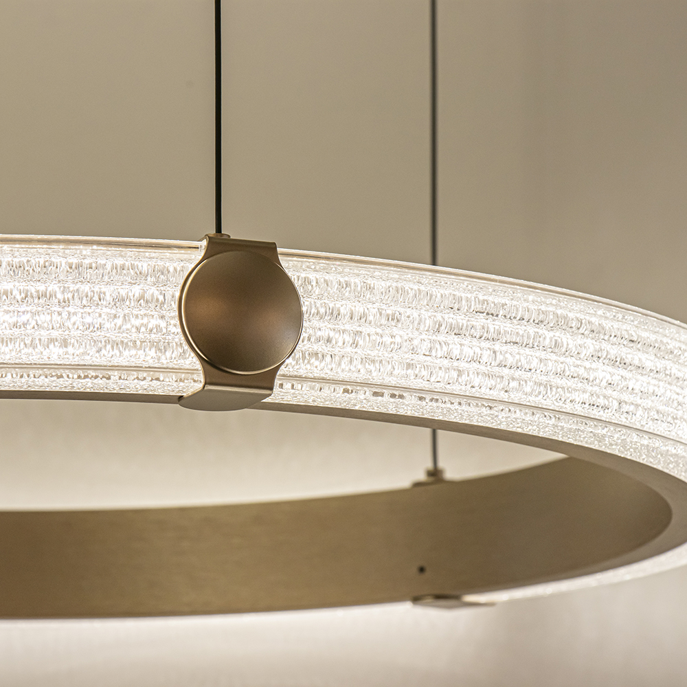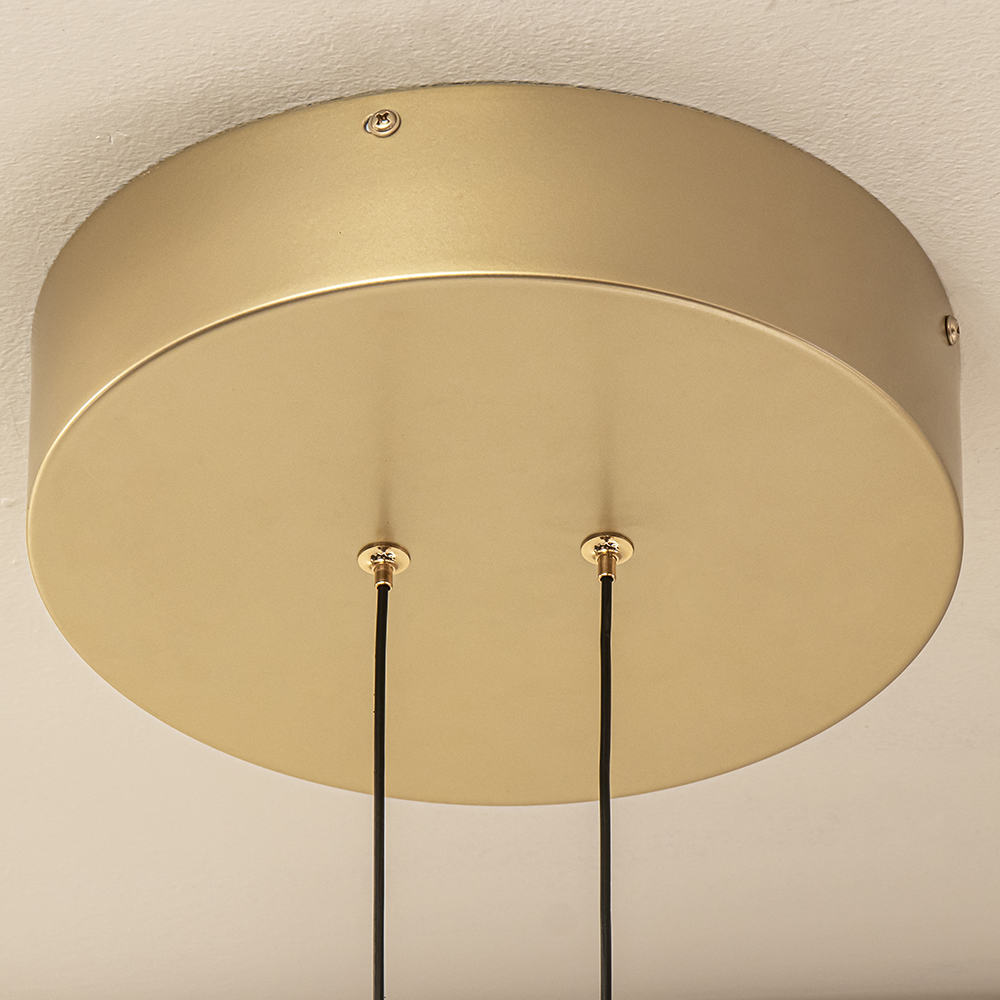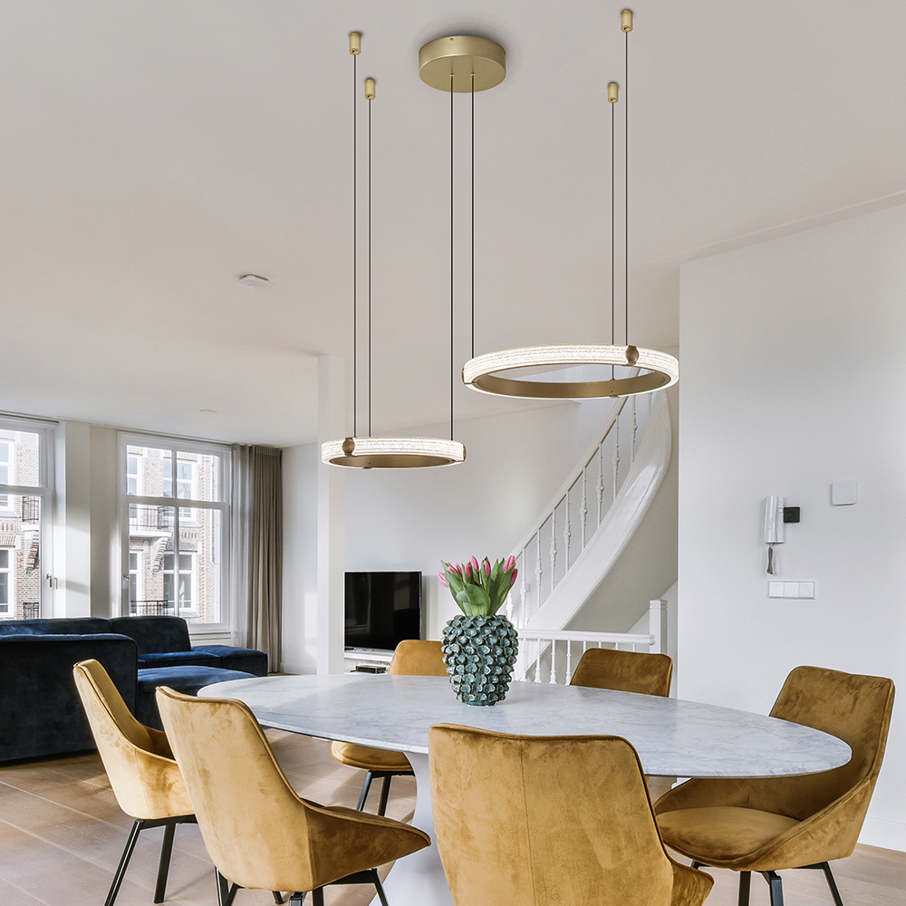 Deze prachtige design hanglamp heeft een elegante en luxe uitstraling. De lamp is samengesteld uit twee ringen die naar wens in hoogte zijn te verstellen. Doordat ze verschillen in hoogte en grootte ontstaat er een speels effect. De ringen zijn uitgevoerd in het geborsteld goud met een kunststof rand aan de buitenzijde. Hier is een kristaleffect in verwerkt dat mooi oplicht als de lamp wordt ingeschakeld. Zo krijgt de moderne hanglamp een extra luxe uitstraling. De hanglamp ringen is dimbaar middels een externe dimmer (exclusief) en is een mooie toevoeging boven een langwerpige eettafel.