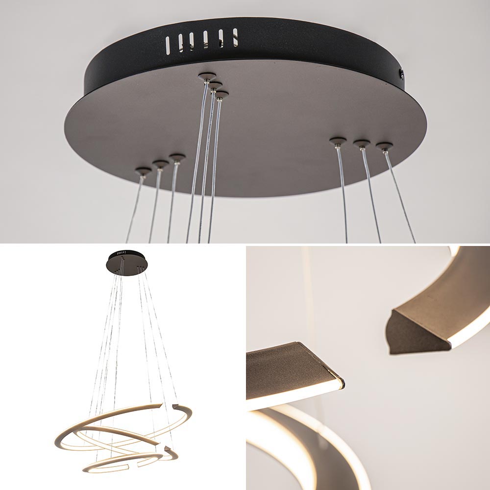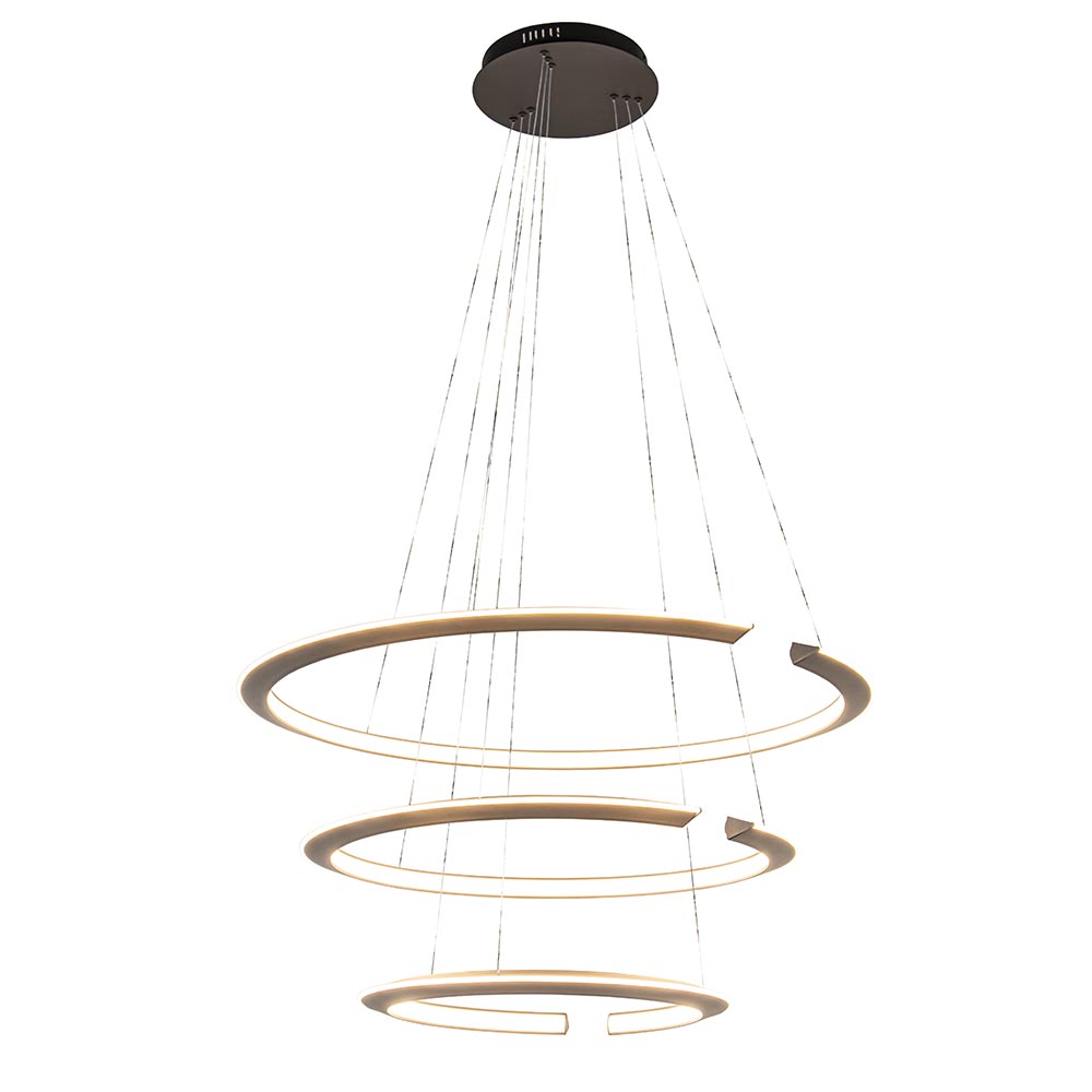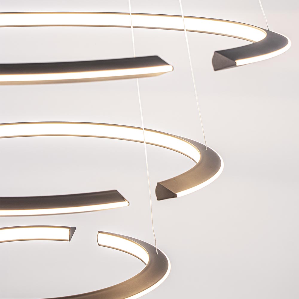 Een grote hanglamp met een uniek design. Deze moderne ronde hanglamp bestaat uit drie zwarte ringen die naar wens op hoogte zijn te hangen. Iedere ring is voorzien van een opening om de lamp nog opener en ruimtelijker te laten ogen. De ringen zijn zowel van binnen als van buiten voorzien van LED strips die met 2700 Kelvin zorgen voor een sfeervolle warm witte verlichting. De ringen hangen aan drie staalkabeltjes die gemakkelijk zijn in te korten. Het leuke aan de ringen is dat deze op verschillende manieren kunnen worden opgehangen. Zo kunt u kiezen om de ringen mooi verdeeld onder elkaar te hangen, maar de ringen kunnen ook schuin hangen zodat ze elkaar overlappen. Op deze wijze ontstaat er een speels lijnenspel en creëert u op eigen wijze een unieke lamp. De moderne LED hanglamp wordt met een ronde bevestiging aan het plafond opgehangen en is dimbaar dmv een externe dimmer (exclusief).