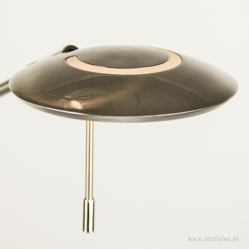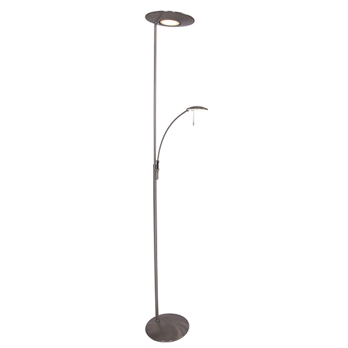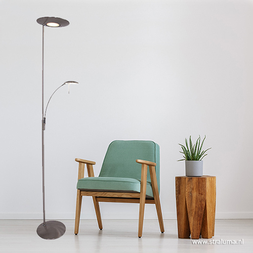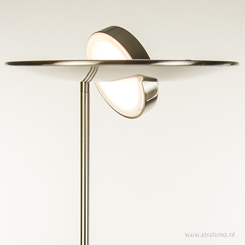 Deze moderne vloerlamp in een staal kleur is een mooie toevoeging aan uw interieur. De staande lamp is voorzien van een uplighter en een leeslamp voor extra gemak. Voordeel van de uplighter is dat de middenspot zowel naar onder als naar boven kan schijnen. De spot is gemakkelijk te draaien naar een gewenste positie. Ook de schaal zelf is te kantelen voor de juiste manier van belichten. Het leeslampje is ook te verstellen en heeft als leuk extraatje een speels licht effect aan de bovenzijde. Deze strakke vloerlamp is voorzien van LED lichtbron en is in vier kleuren verkrijgbaar: brons, staal, messing en zwart. Beide lichtbronnen zijn afzonderlijk van elkaar te dimmen.