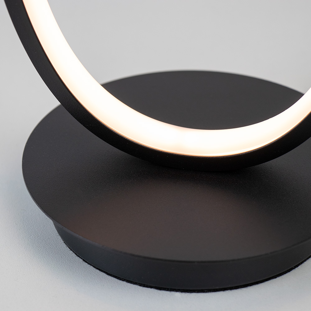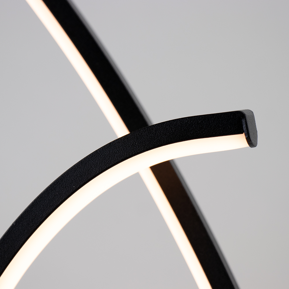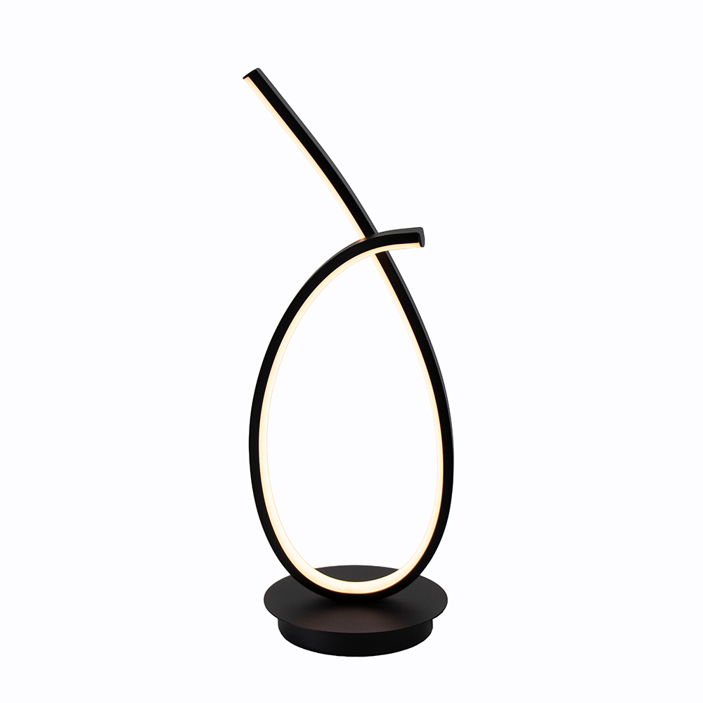 De Lina tafellamp is een eigentijds kunstobject en functionele lichtbron in één. Met haar vloeiende, asymmetrische vormgeving en minimalistische uitstraling brengt deze lamp direct karakter in je interieur. Het zwarte armatuur vormt een elegante lus, waarin een geïntegreerde LED-lichtlijn warm licht uitstraalt. Perfect als sfeerverlichting op een bureau, dressoir of nachtkastje. De lamp is uitgevoerd in mat zwart met een zachte structuurafwerking en staat stevig op een ronde voet. Dankzij de geïntegreerde schakelaar in het snoer is Lina eenvoudig te bedienen.