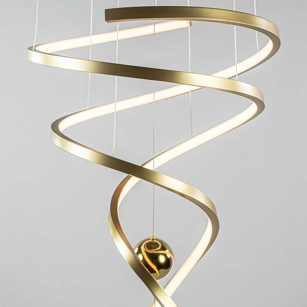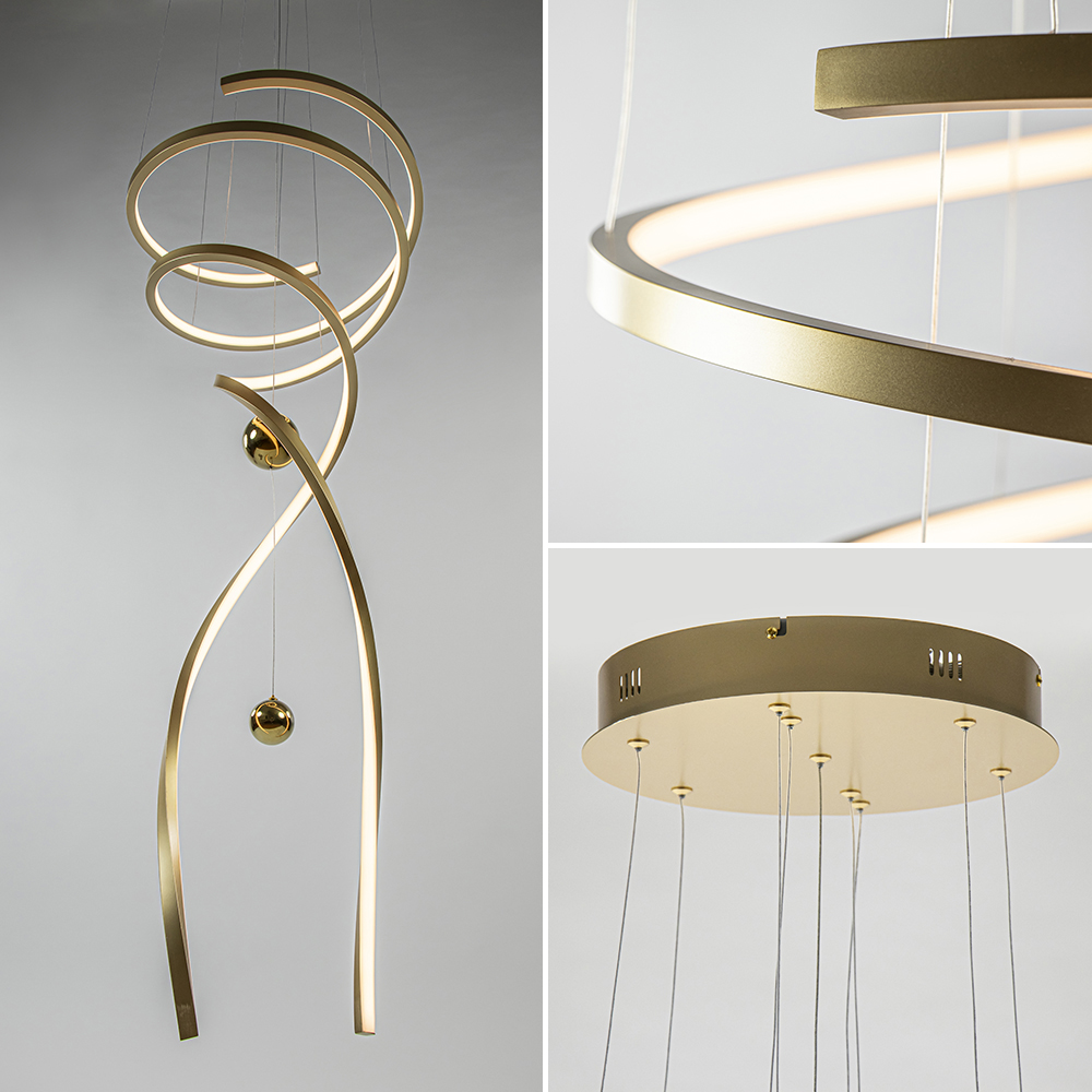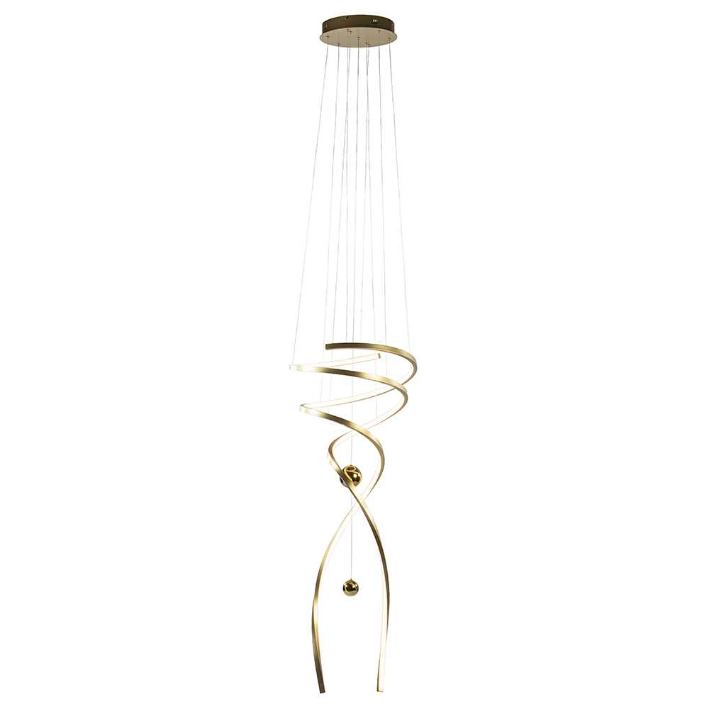 Ideaal voor een wat kleinere of smalle vide. Deze moderne videlamp heeft een maximale hoogte van 4 meter en is naar wens in te korten. Het armatuur bestaat uit 2 delen die los van elkaar, maar wel om elkaar heen hangen. Beide delen zijn voorzien van geïngtegreerd LED dat met 2700 Kelvin een sfeervolle warm witte verlichting geeft. De LED hanglamp is in het midden afgemaakt met 2 gouden ballen om een speels effect te creëren. De moderne videlamp krul is dimbaar middels een externe dimmer (exclusief).