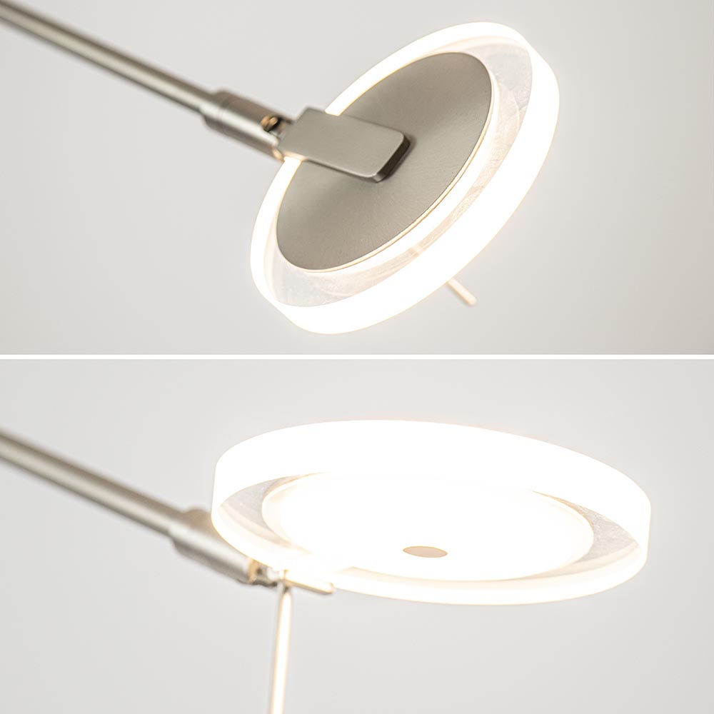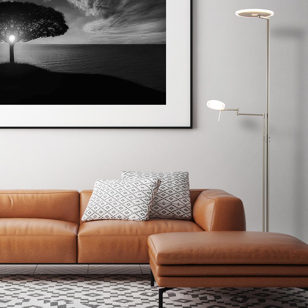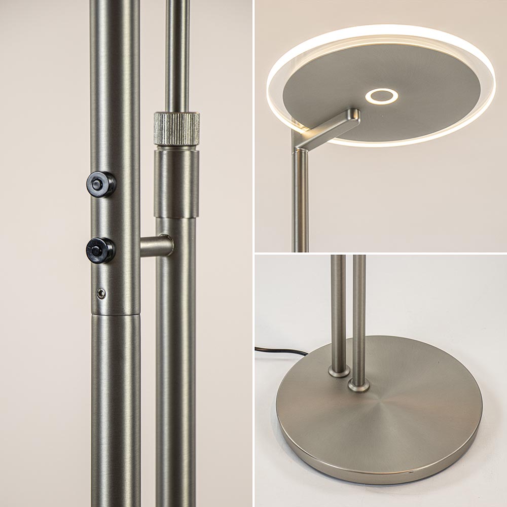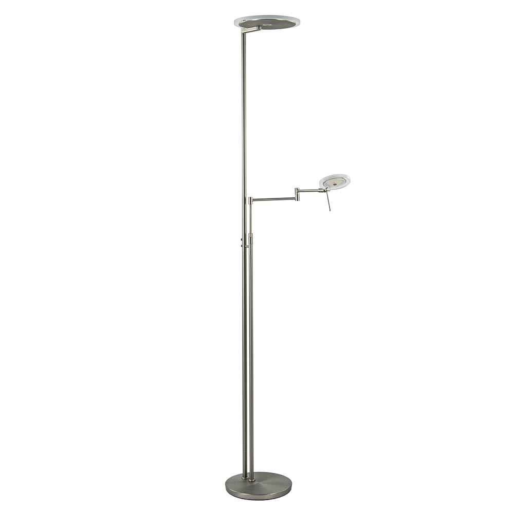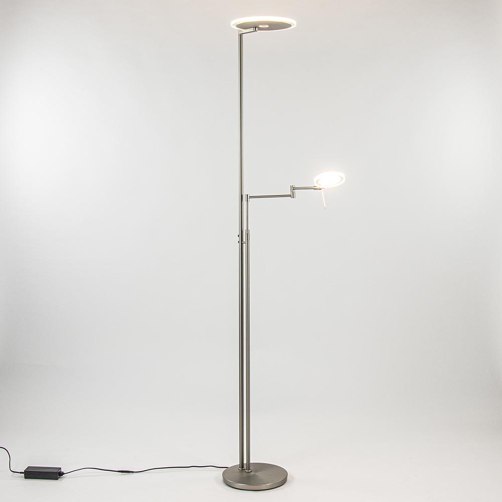 Een mooie luxe versie van een klassieke uplighter. De moderne vloerlamp is vervaardigd uit staal en is mooi gecombineerd met helder glas. Naast de mooie uitstraling die de lamp heeft, is deze ook zeer functioneel. Zo kunt u de leesarm in hoogte en lengte verstellen en is de kap te draaien en te kantelen zodat u deze gemakkelijk naar de juiste richting kunt plaatsen. De uplighter en de leeslamp zijn los van elkaar te bedienen en te dimmen d.m.v de twee dimmers midden op het armatuur. Één keer drukken en de lamp gaat aan, houdt u de dimmer langer ingedrukt dan dimt deze totdat u weer loslaat. De moderne vloerlamp is volledig voorzien van LED en geeft een sfeervolle warm witte verlichting. De uplighter met leeslamp heeft een zwart snoer van 235 cm.