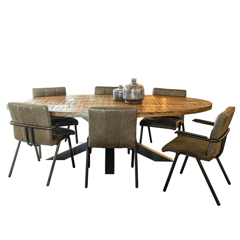 Mooi bij een ovale tafel, maar ook prima toepasbaar bij een rechthoekige of ronde tafel. Deze eetkamerstoel heeft een stoere robuuste uitstraling. De zitting en rugleuning zijn volledig van leder en de pootjes en het frame zijn van metaal met een zwarte afwerking. De sticksels in de rugleuning geven de stoel een landelijke look en de armleuningen geven extra comfort bij het dineren of natafelen. De stoel is ook mooi te combineren met het model zonder armleuning.