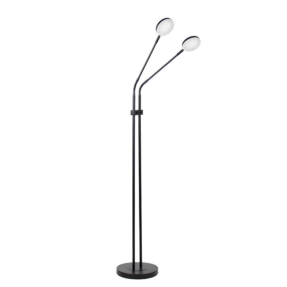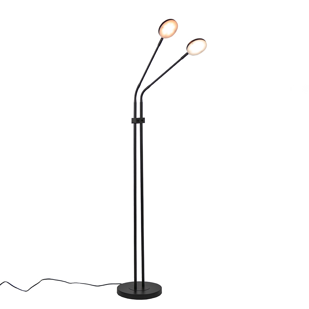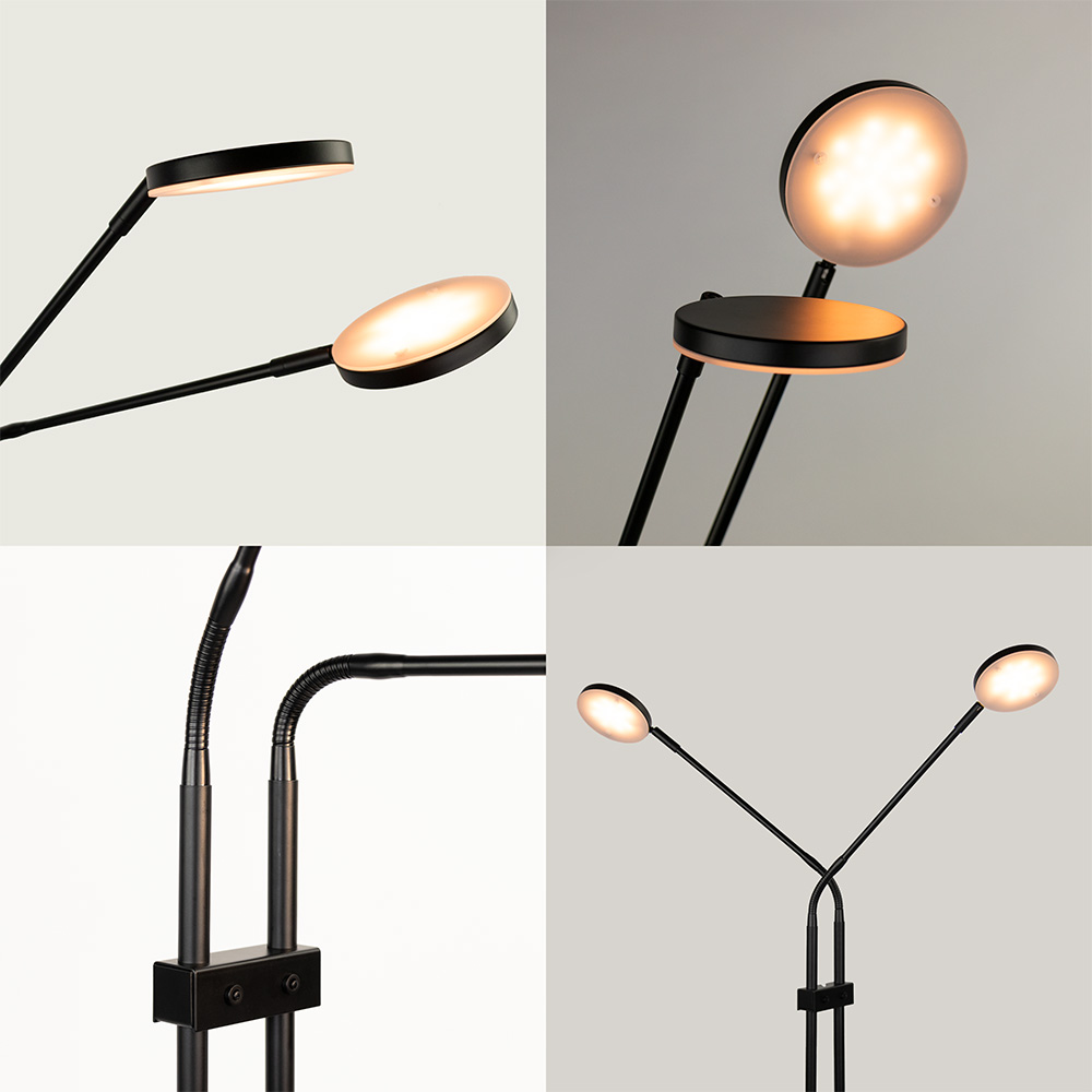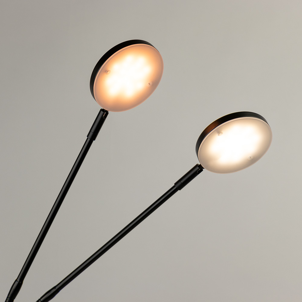 Deze moderne vloerlamp heeft twee elegante, ronde lichtpunten die ideaal zijn voor het creëren van een sfeervolle en functionele verlichting. De lampen is volledig naar wens af te stellen. De kappen zijn draai- en kantelbaar en bieden de mogelijkheid om het licht naar wens te richten. De slanke, matzwarte armatuur en de verstelbare armen geven de lamp een minimalistische uitstraling die perfect past in een eigentijds interieur. De geïntegreerde LED-lichtbronnen zijn energiezuinig, dimbaar en in 3 kleur temperaturen in te stellen. Zo bieden zij zowel warme als heldere verlichting. Of je nu voor gerichte taakverlichting of voor een gezellige sfeer kiest, deze lamp is een uitstekende keuze voor elke ruimte.