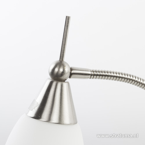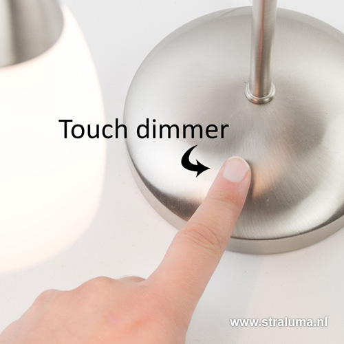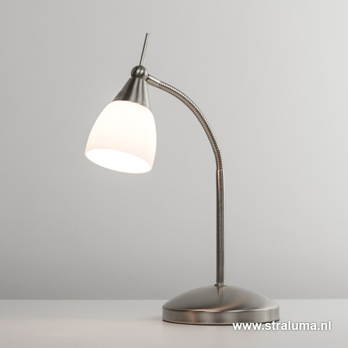 Deze tafellamp van de serie Touchy is uitgevoerd in het nikkel met een glazen kap. Het is een heel gebruiksvriendelijke lamp, door middel van aanraking kunt u deze lamp in lichtsterkte aanpassen en door de flexible arm kunt u hem bewegen in de richting waar u het licht wilt hebben. Hij is niet alleen functioneel, maar ook sfeervol als u hem zacht laat branden krijgt u door het glazen kapje warm licht.