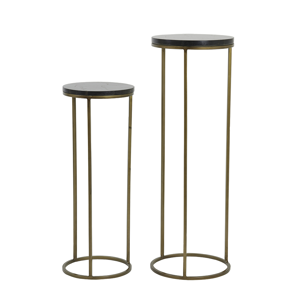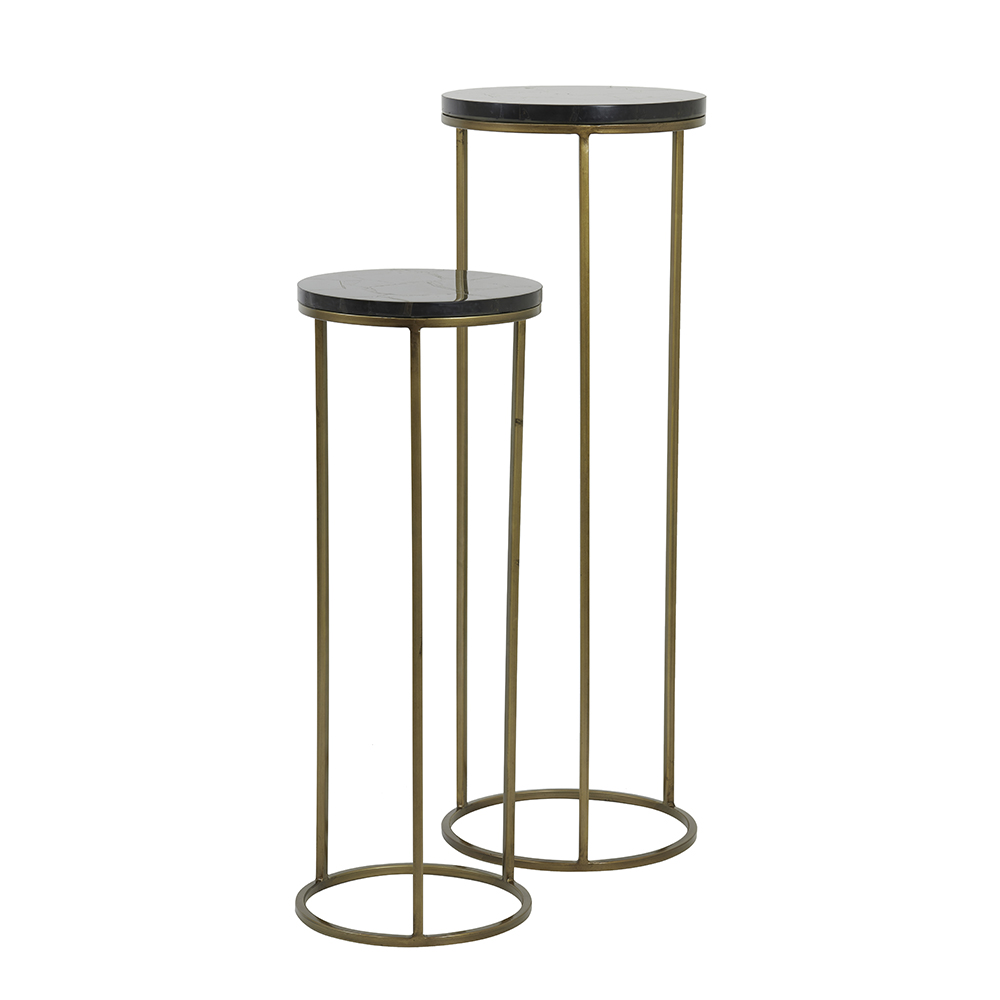 Deze chique pilaren/bijzettafels bieden ruimte voor leuke accessoires of een mooie plant. De tafeltjes hebben een hoogte van 80 en 100 cm en zijn gemaakt van metaal dat is uitgevoerd in het goud. Dit is gecombineerd met een zwart marmeren blad. Ideaal voor in de hal, in een lege hoek of naast de bank.