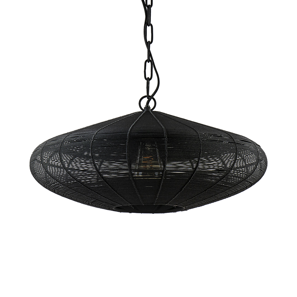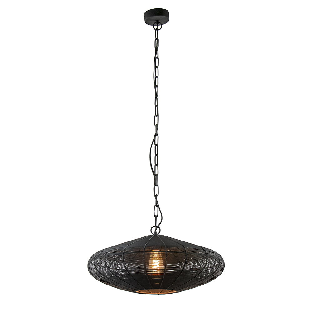Hanglamp Bahoto van Light and Living is een stoere draadlamp met een robuuste afwerking. De zwarte hanglamp heeft een extra matte afwerking wat de lamp een industriële en tevens chique look geeft. De ronde kap heeft een doorsnede van 51 cm en hangt aan een stevige ketting en plafondplaat. Bahoto heeft een maximale hoogte van 110 cm en is naar wens in te korten door er schakels tussenuit te halen. De mat zwarte draadlamp is dimbaar middels een externe dimmer (exclusief) en wordt geleverd exclusief lichtbron. Een leuke toevoeging boven een eettafel of salontafel.