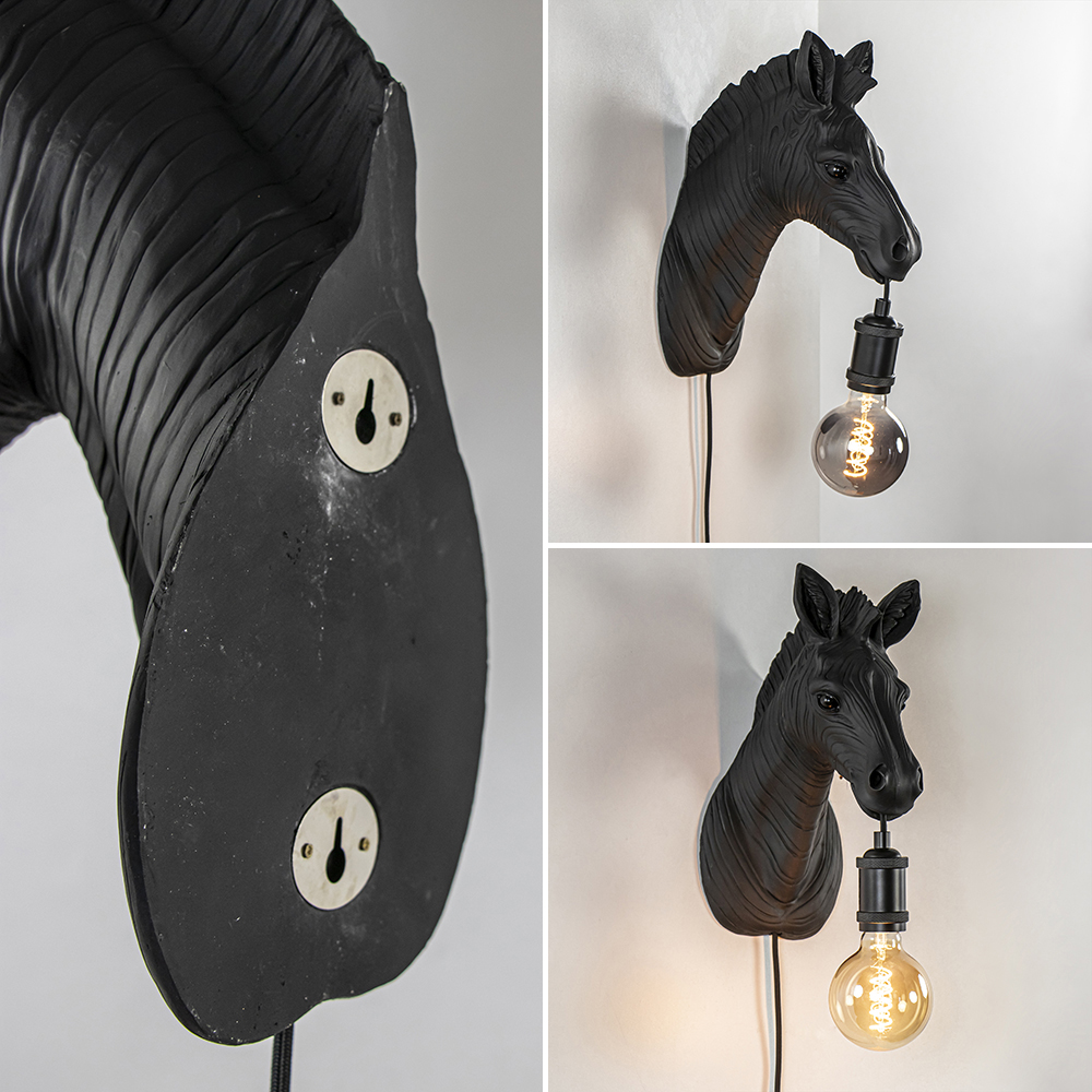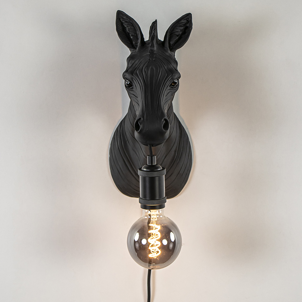 Helemaal trendy zijn de lampen in de vorm van dieren. Deze leuke zebra wandlamp past helemaal in de populaire botanische woonstijl. De combinatie van mat zwart met het zwart van de fitting zorgt voor een stoer/trendy effect. Leuk voor in de woonkamer of slaapkamer. Deze zebra wandlamp wordt geleverd met zwart snoer.