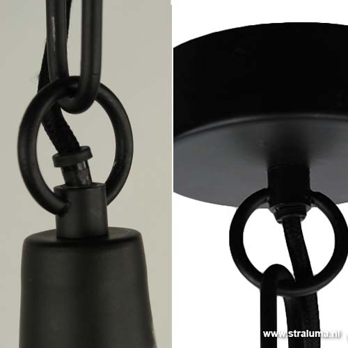 – Ø 40 cm – totale hoogte van de kap 75 cm, gehele lamp 174 cm (incl. ketting) – hoogte kegel 37 cm, hoogte draad deel 38 cm – plafondbevestiging Ø 10 cm, hoogte 2,8 cm – zwart stofomwonden snoer (strijkijzer snoer) – gewicht lamp 3,9 kg