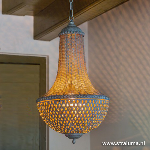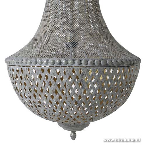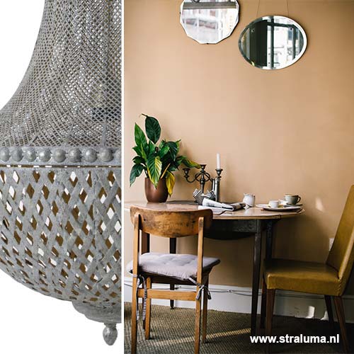 Echt een super gave hanglamp helemaal van deze tijd. De kroon ‘Angelique’ ziet eruit als een ouderwetse zak kroonluchter maar dan is deze uitvoering helemaal van metaal. Een knipoog naar vroeger maar de uitvoering is super trendy. De buitenkant van de Angelique is bewerkt zodat het eruit ziet als oud zilver maar de binnenkant is goud gespoten. Dit zie je vrijwel niet als de metalen hanglamp uit is maar wanneer hij brand geeft dit een super warme sfeer. Kijk maar op één van onze afbeeldingen. De hanglamp Angelique is een top lamp voor boven een grove houten eettafel of als eyecather in de slaapkamer. Natuurlijk wanneer u de ruimte heeft qua hoogte en deuren is deze trendy hanglamp ook schitterend in de hal.