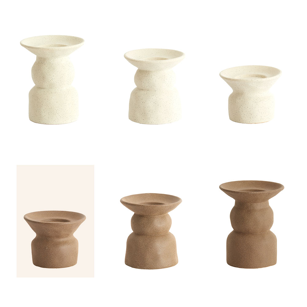 De matte tinten in warm bruin en zacht crème benadrukken het ambachtelijke karakter van het ontwerp. De serie bestaat uit drie formaten per kleur, waardoor je ze prachtig kunt combineren voor een speels en harmonieus geheel.