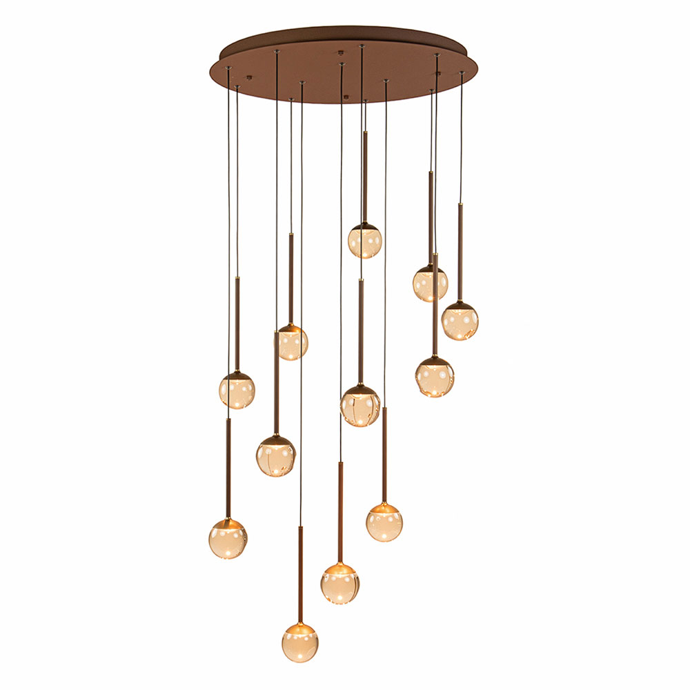 De Lucide Calina hanglamp rond is een moderne blikvanger die perfect tot zijn recht komt in hoge ruimtes, zoals een vide of hal. Deze 12-lichts designlamp heeft een ronde plafondplaat met een diameter van 63 cm en combineert een warme koffiebruine afwerking met elegante glazen bollen van 9,9 cm doorsnee. Het speelse lijnenspel van de pendels zorgt voor een luxueuze en luchtige uitstraling.