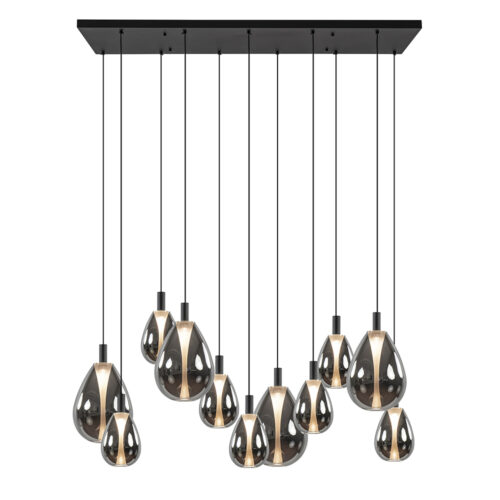 Een echte wauw-factor voor boven de eettafel. Deze luxe 11-lichts hanglamp straalt een en al luxe en elegantie uit. De hanglamp heeft een mat zwart armatuur dat is gecombineerd met smoke glazen kappen met een titanium coating. Dit geeft de hanglamp echt die hotel chic uitstraling. Dit wordt versterkt door het matte binnenglas dat oplicht wanneer de lamp wordt ingeschakeld. Zo onstaat er een mooi effect in het glas. De grote hanglamp is voorzien van geïntegreerd LED en geeft met 2700 Kelvin een fijne en sfeervolle warm witte verlichting. Dit is dimbaar middels een externe dimmer (exclusief).