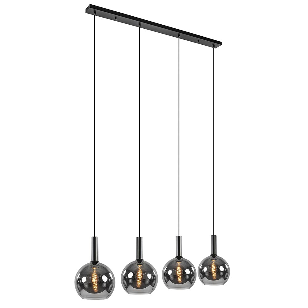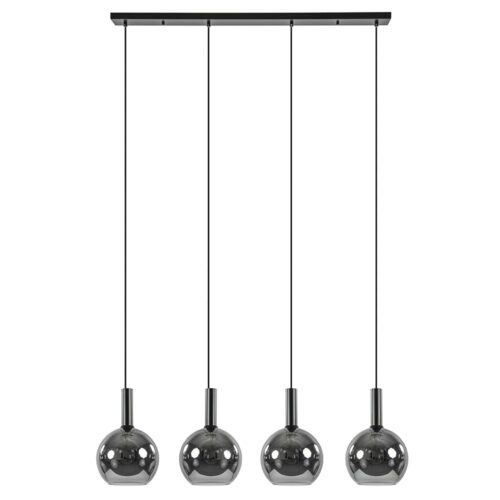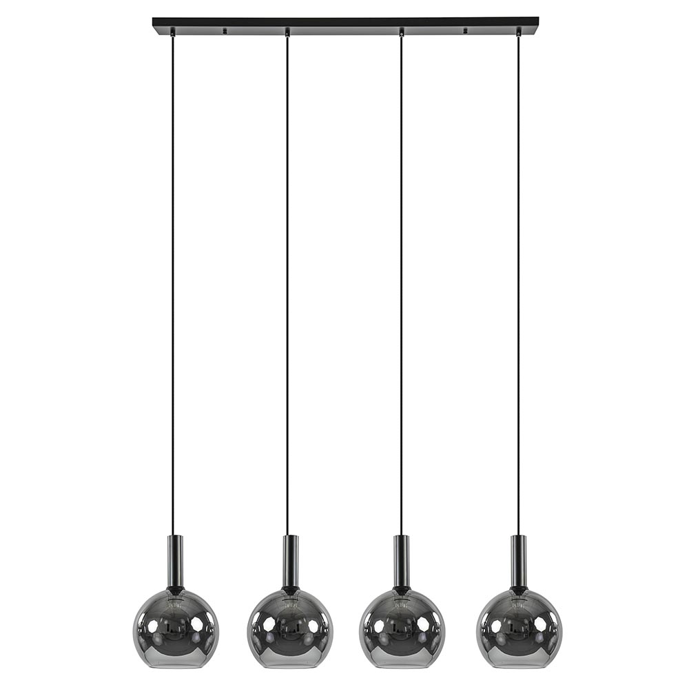 Helemaal binnen de huidige trends en sfeervol voor boven de eettafel. Deze luxe hanglamp is een echte must voor het interieur. De hanglamp is voorzien van 4 smoke glazen bollen met een titanium coating. Dit zorgt voor een spiegelend effect en geeft de hanglamp echt een luxe uitstraling. Dit wordt nog eens versterkt door de combinatie met de mat zwarte cilindervormige fittingen. De 4-lichts hanglamp heeft een maximale hoogte van 185 cm en wordt aan het plafond bevestigd met een balk van 110 cm. De trendy hanglamp is dimbaar middels een externe dimmer (exclusief) en wordt geleverd zonder lichtbron (4x E27).