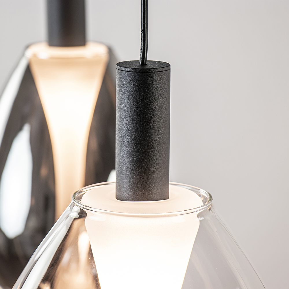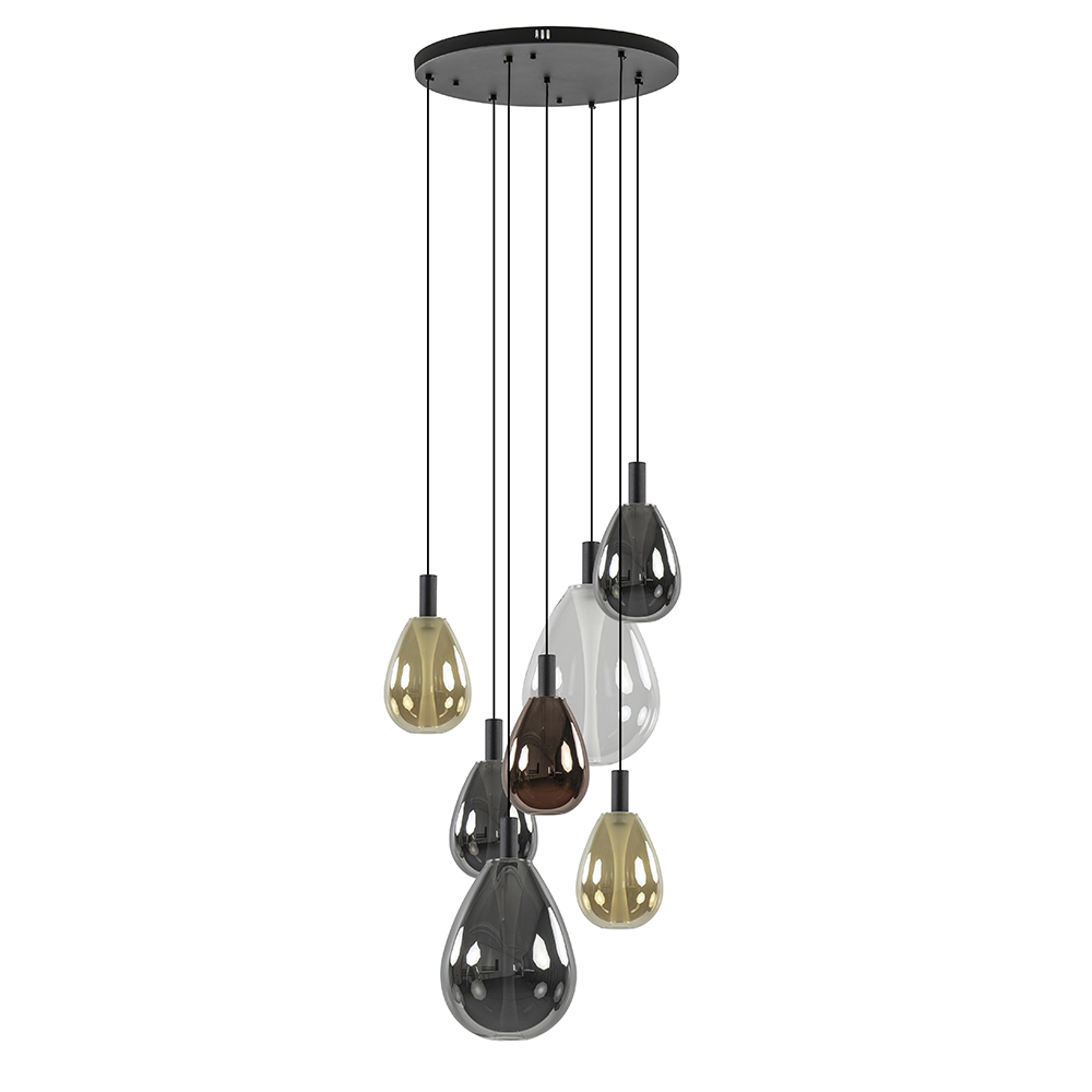 Een prachtig exemplaar dat prima geschikt is voor diverse woonstijlen en ruimtes. Deze stijlvolle 7-lichts hanglamp is een mooie toevoeging aan de eet- of woonkamer, maar kan door zijn hoogte van 3,5 meter ook in een vide worden toegepast. De ronde hanglamp is voorzien van een mat zwart armatuur dat is gecombineerd met diverse glazen kappen in de kleur smoke, amber, rose en helder. Dit geeft de hanglamp echt die luxe en elegante uitstraling. Dit wordt versterkt door het matte binnenglas dat oplicht wanneer de lamp wordt ingeschakeld. Zo onstaat er een mooi effect in het glas. De grote hanglamp is voorzien van geïntegreerd LED en geeft met 2700 Kelvin een fijne en sfeervolle warm witte verlichting. Dit is dimbaar middels een externe dimmer (exclusief). Een pracht exemplaar dat een ware eyecatcher is in het interieur.