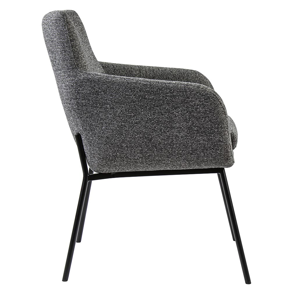 Een prachtige eetkamerstoel in een gemeleerde stof. De armstoel heeft een comfortabele zitting en de armleuningen bieden extra ondersteuning tijdens het dineren en natafelen. De stoffen zitting heeft een metalen onderstel die is voorzien van een zwarte finish. Dit geeft de stoel een moderne look. De slanke pootjes houden het geheel lichtig en open.