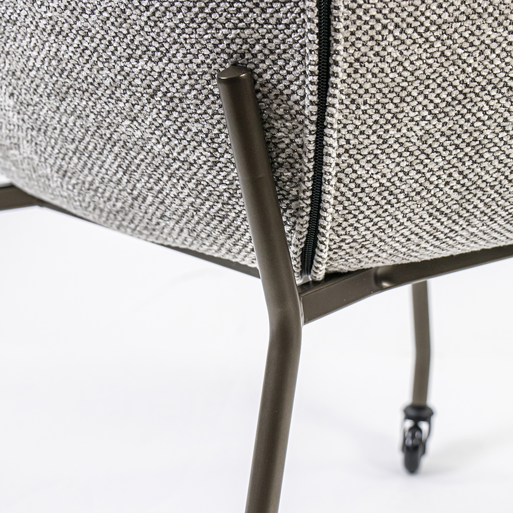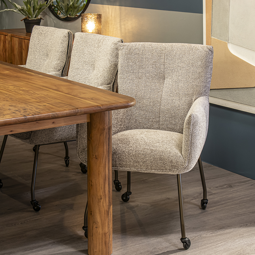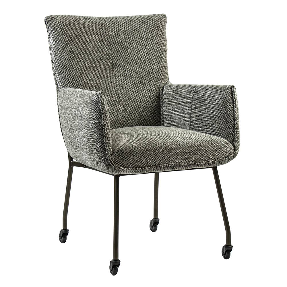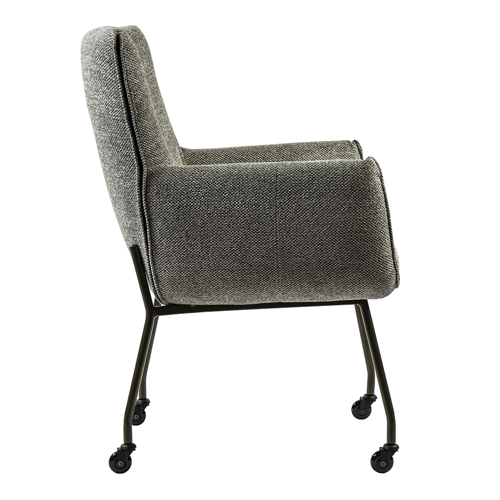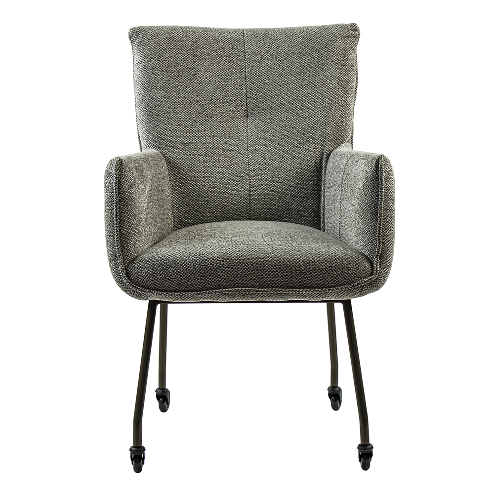 Deze luxe armstoel heeft een zeer comfortabele zitting die wordt vergroot door de armleuningen. De eetkamerstoel heeft een stoffen zitting in de kleur taupe. Dit is gecombineerd met bronzen pootjes met een zwart wieltje. Zo kunt u gemakkelijk aanschuiven aan tafel. Een heerlijke stoel om lekker in te dineren en natafelen.