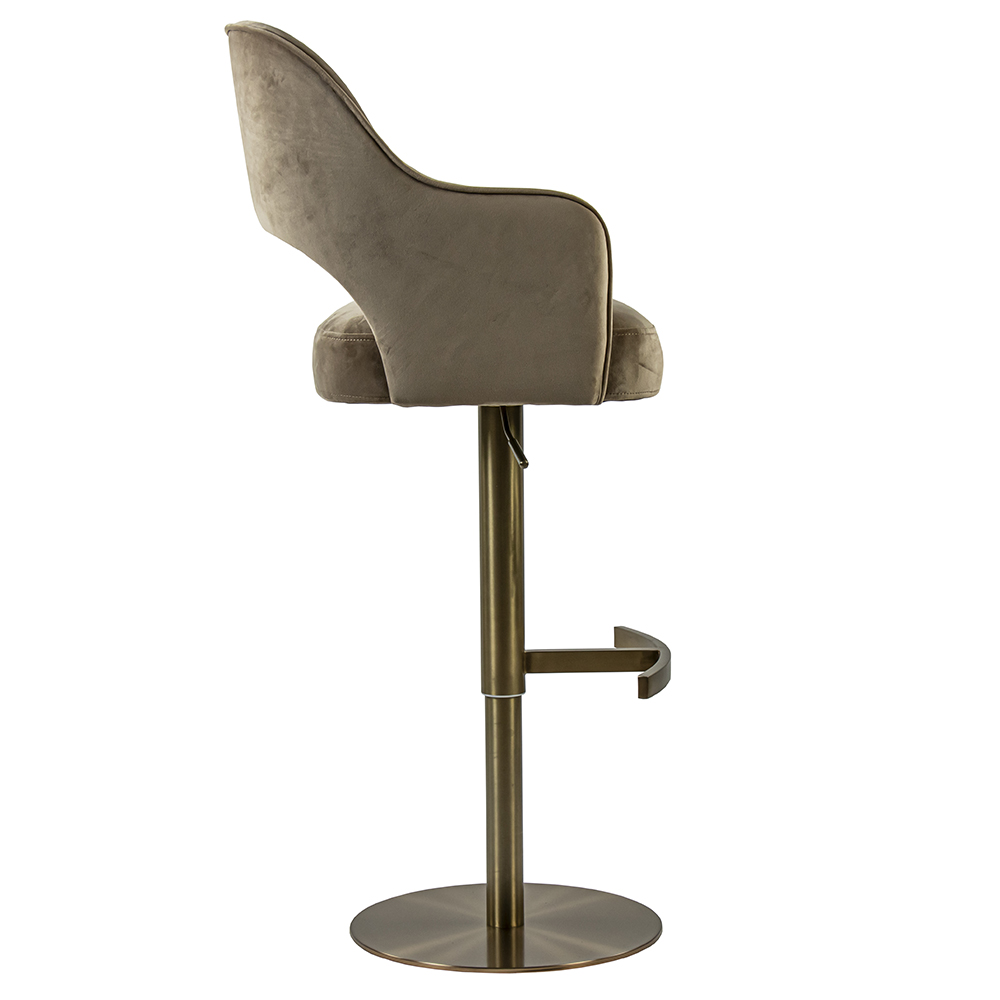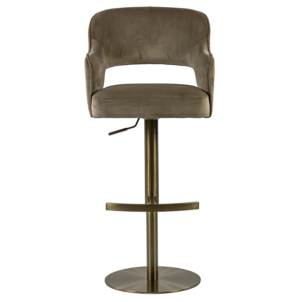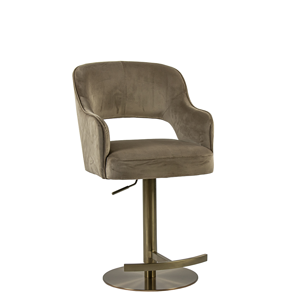 Deze chique barkruk maakt de keuken of bar helemaal af. De barstoel heeft een fijn zitcomfort en is in hoogte te verstellen. De voetensteun biedt extra support en helpt bij het op en afstappen van de kruk. De zitting is volledig van stof en uitgevoerd in het velours bruin. De metalen poot is voorzien van een bruin/gouden finish en gemakkelijk in hoogte te verstellen dmv de hendel onder de zitting.