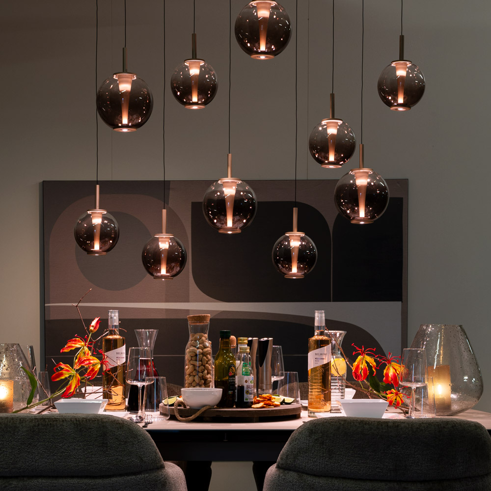 Deze imposante 13-lichts hanglamp is ontworpen als echte blikvanger in het interieur. De combinatie van een slank, architectonisch frame in brons met amberkleurige glazen kappen zorgt voor een warme, luxe uitstraling die direct sfeer toevoegt aan de ruimte. Ideaal boven een eettafel van 220–300 cm, een kookeiland of als statement piece in een open woonkamer.