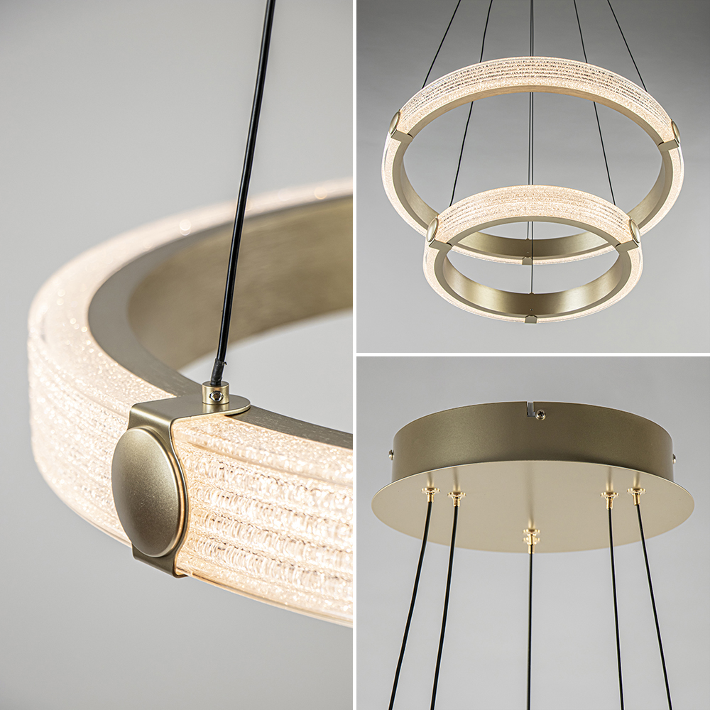 – afm: Ø60×150 cm – bevestiging: Ø25×5,5 cm – ring 1: Ø60×5 cm – ring 2: Ø40×5 cm – metaal, goud – kristaleffect – inclusief LED – 2700 Kelvin – 3500 lumen – dimbaar (exclusief)
