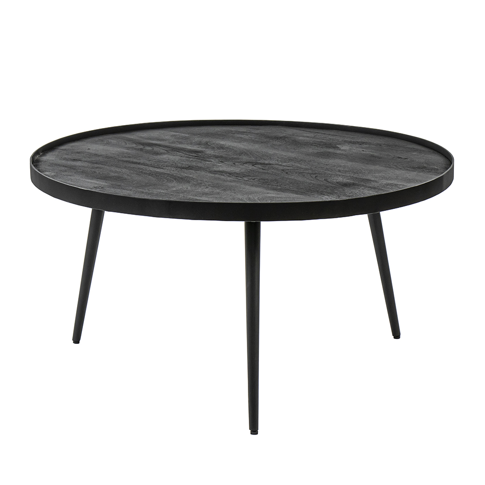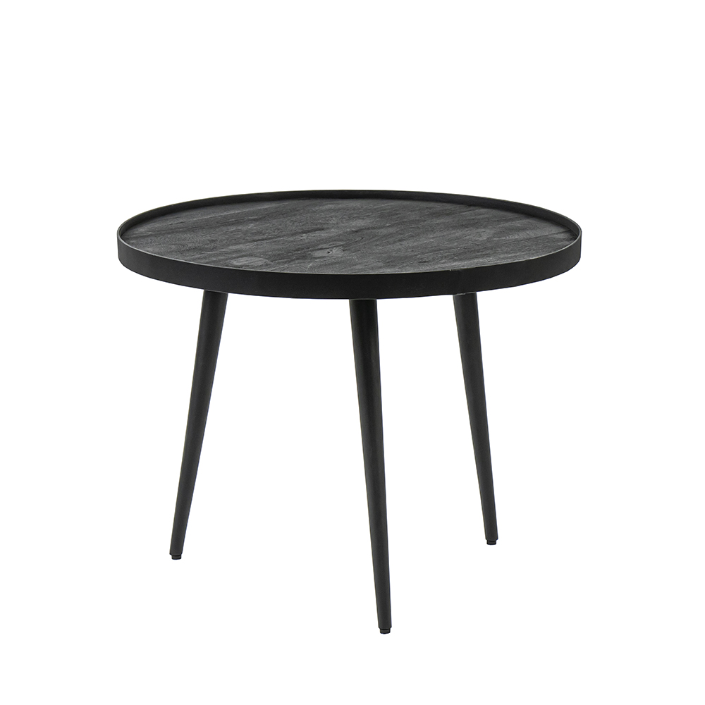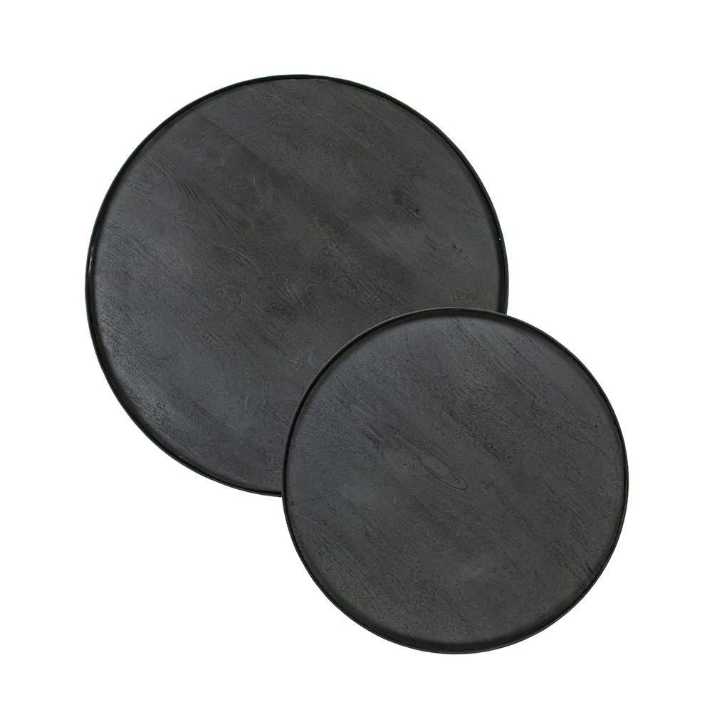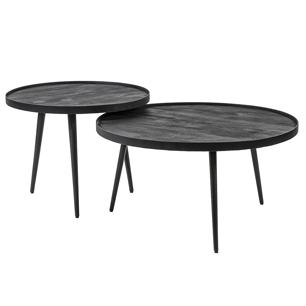 Deze salontafel set bestaat uit twee ronde zwarte metalen frames voorzien van een zwart gecoat houten mango blad. Door de formaat verschillen zijn de salontafels goed onder elkaar te schuiven. Het donkere van de coating van het blad en het zwart metalen frame creëert een stoer en moderne uitstraling.