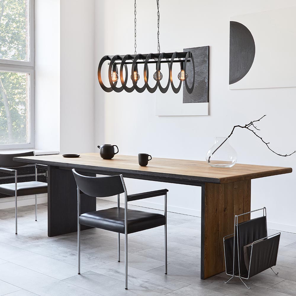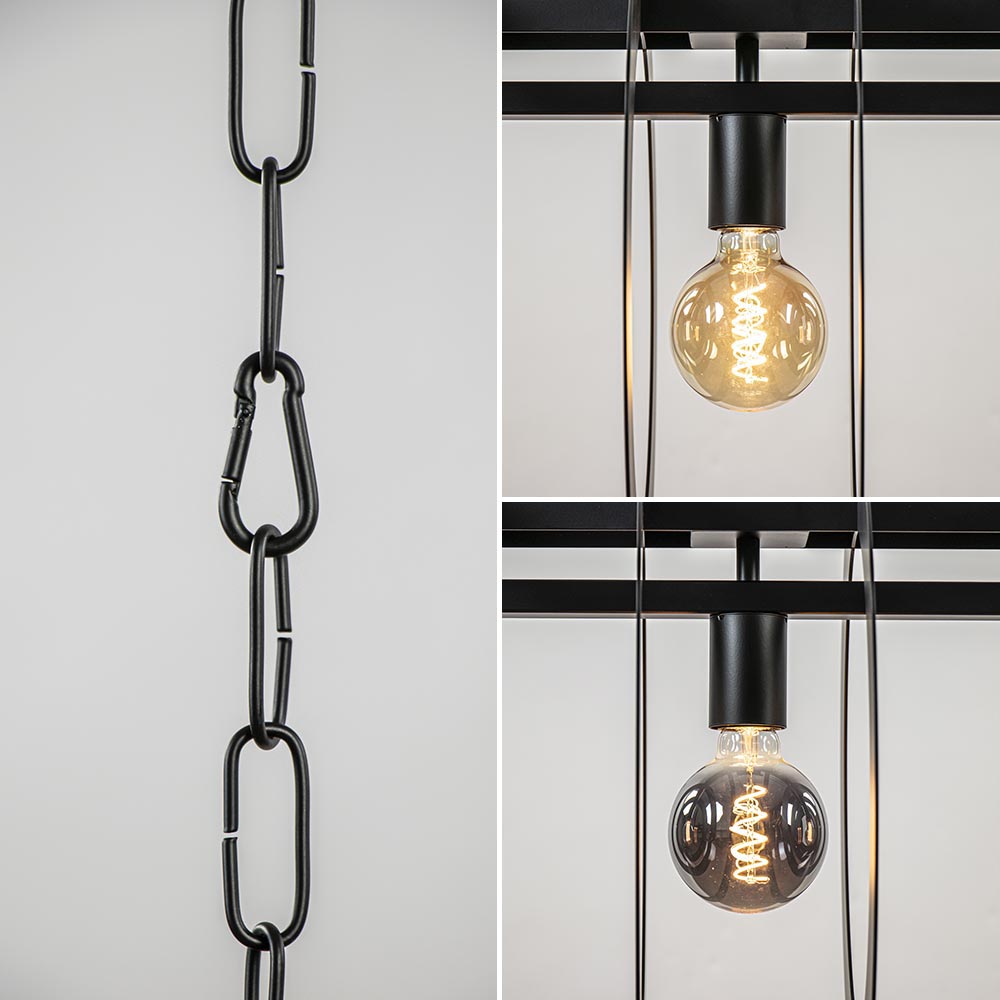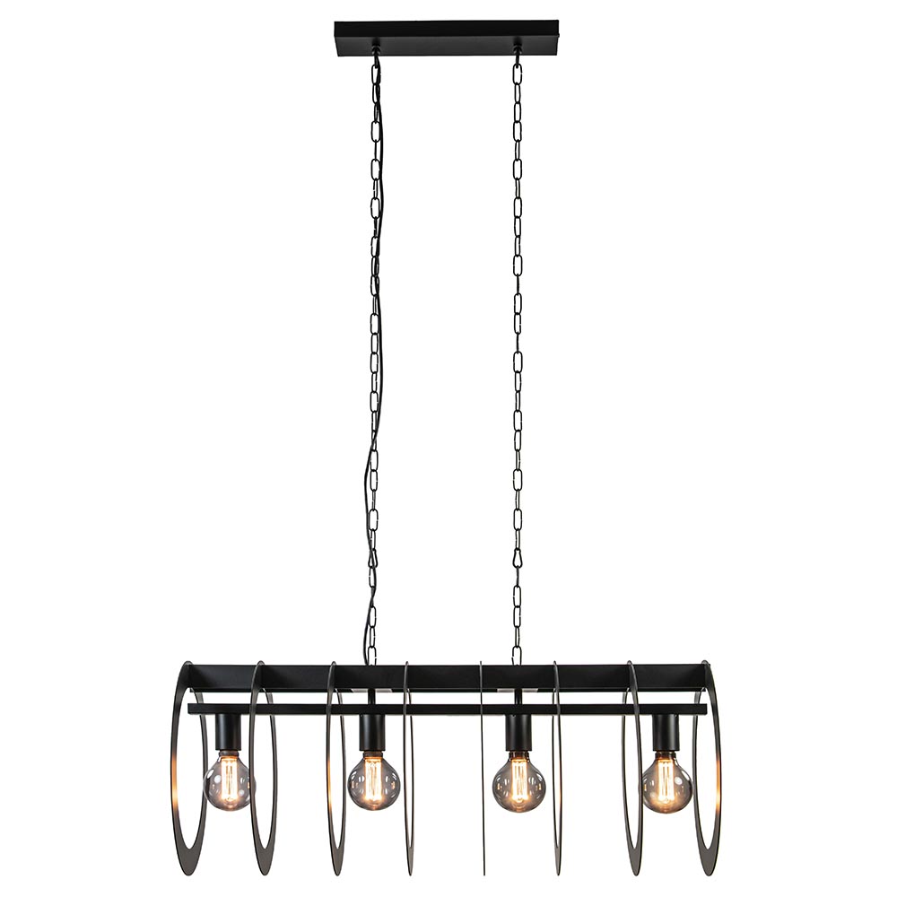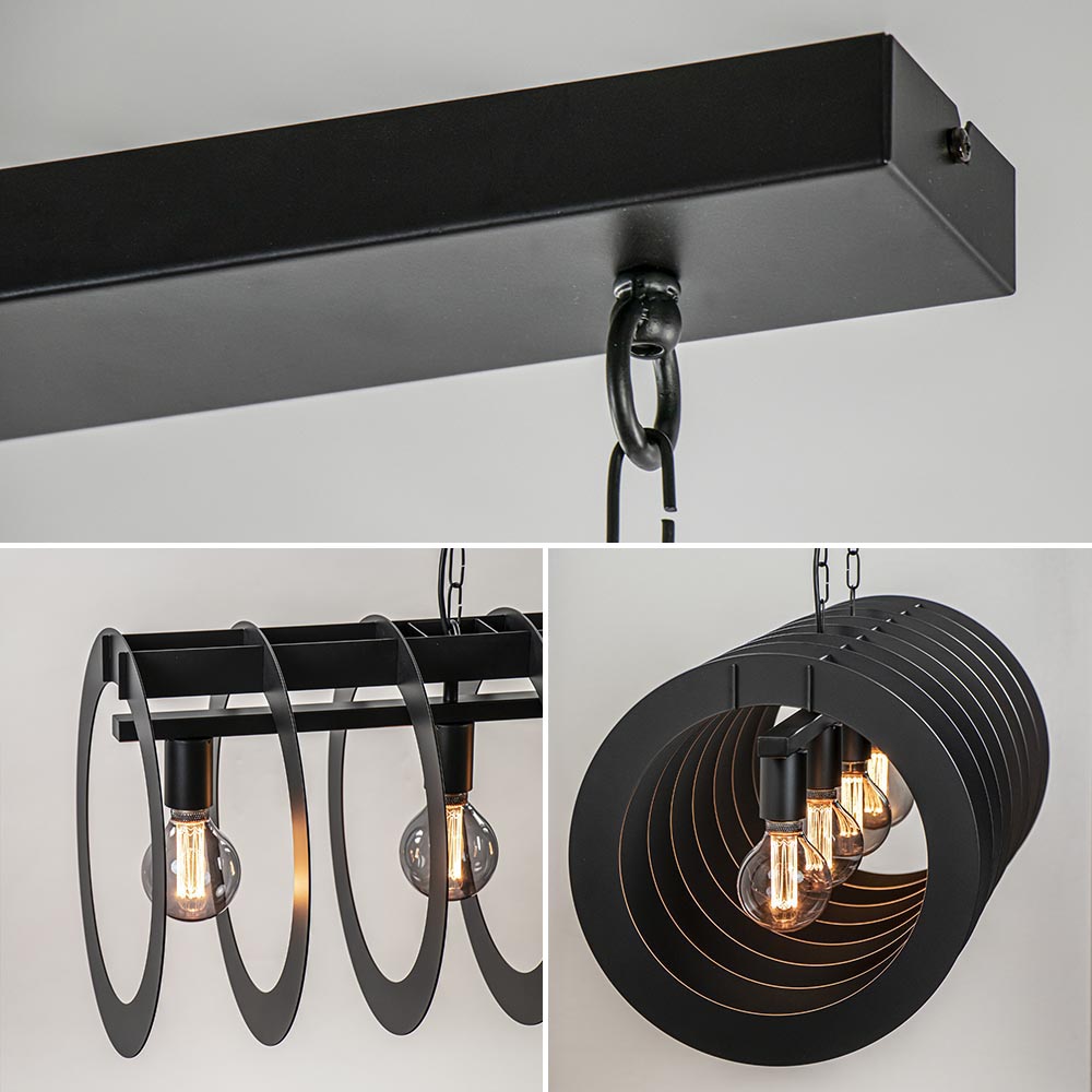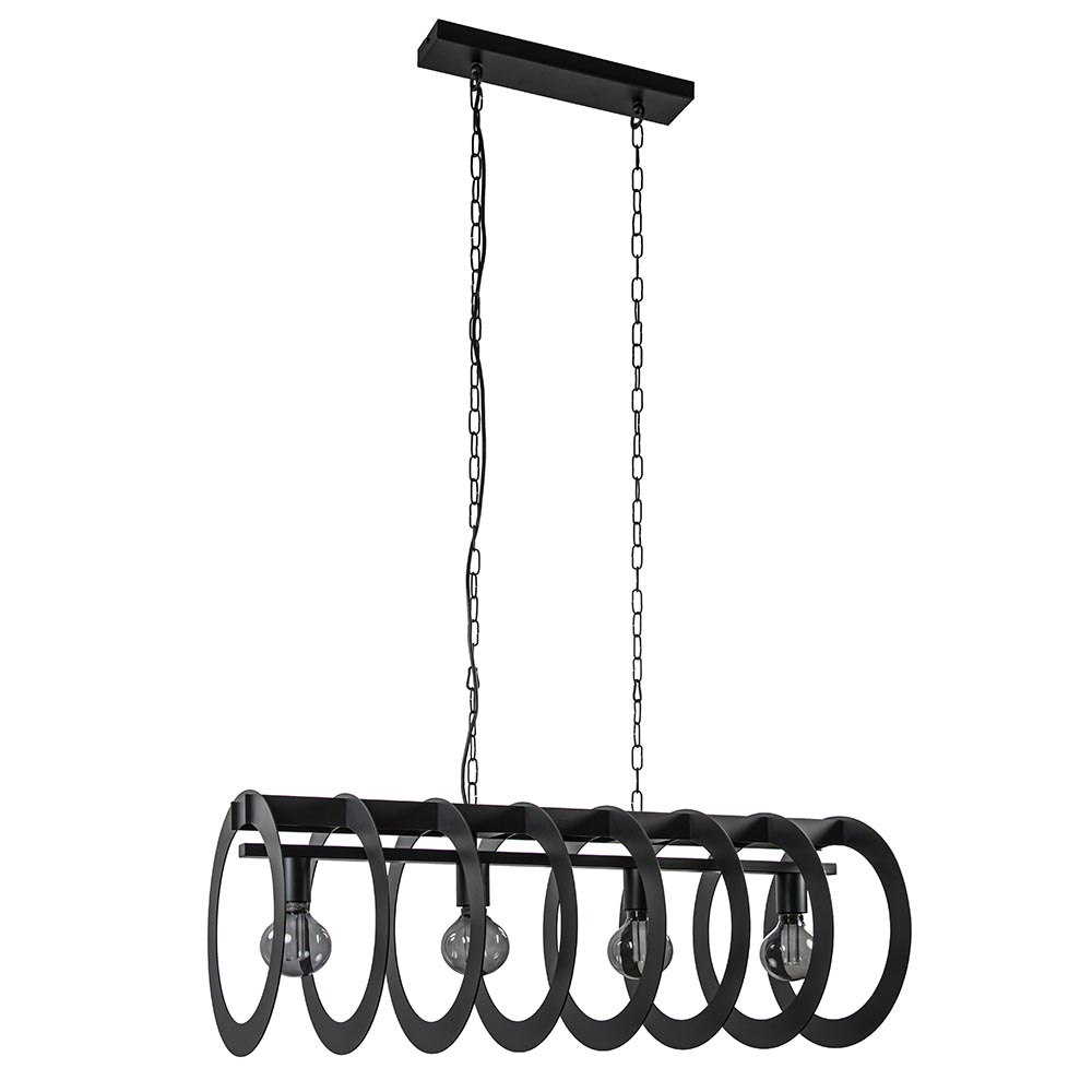 Een industriële hanglamp voor boven de eettafel. Deze mat zwarte hanglamp is volledig gemaakt van metaal en heeft zo een robuuste uitstraling. De kap bestaat uit een metalen balk waar de ringen los op worden geplaatst in de daarvoor bestemde gleuven. De middelste twee kunnen worden geplaatst door eerst de schakel in de ketting los te maken. De ronde kap hangt aan twee kettingen die naar wens zijn in te korten door er schakels tussenuit te halen. De maximale hoogte van de lamp is 155 cm. De stoere hanglamp wordt met een balk van 40 cm bevestigd aan het plafond. Maak de hanglamp af met een mooie decoratieve lichtbron.