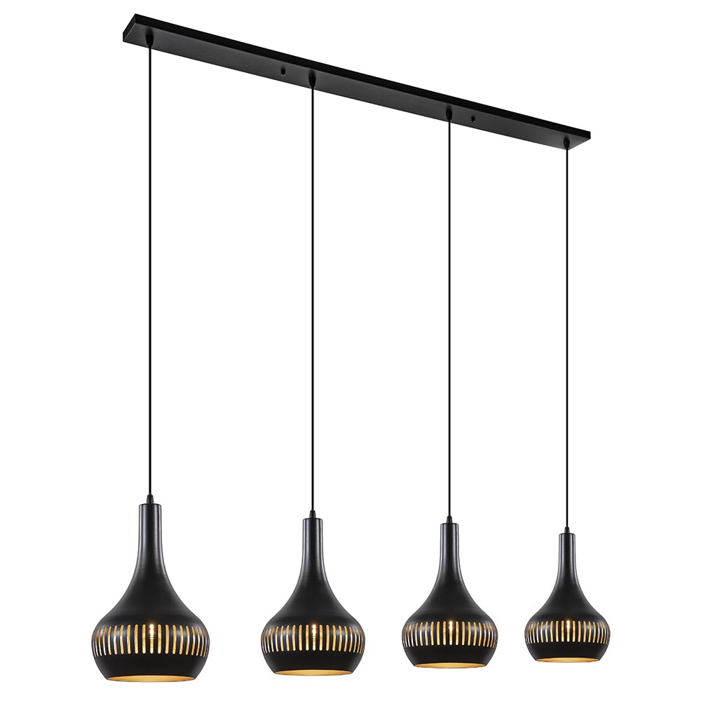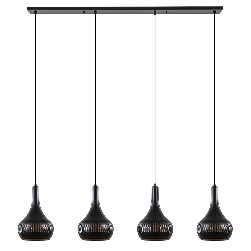 Prachtig boven een stoere eettafel, deze 4-lichts hanglamp met kegel-vormige kappen. De hanglamp is uitgevoerd in het mat zwart en de kappen zijn voorzien van een gouden binnenzijde. De metalen kappen zijn aan de onderzijde open en er zitten in het breedste stuk openingen voor een goede lichtverspreiding. De mat zwarte kappen met goud zijn naar wens op hoogte te hangen met een maximale hoogte van 175 cm. De 4-lichts eettafelhanglamp wordt met een lange balk van 140 cm bevestigd aan het plafond en de hanglamp is dimbaar middels een externe dimmer (exclusief).