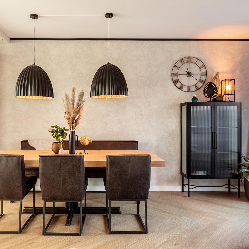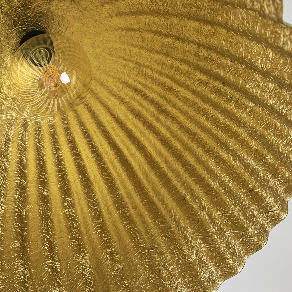 Deze lamp verenigd de luxe van goud en de golvende lijnen in de vormgeving met innovatief materiaal gebruik. Deze bijzondere lamp is gemaakt van een glasvezel composiet. De buitenzijde is glad afgewerkt, de binnenzijde toont de vezels-structuur. Tevens heeft het goud aan de binnenzijde een warme glans, met de lamp aan een schitterend gezicht. Deze lamp past prima in een luxueus interieur, maar zou ook uitermate mooi werken in een modern of romantisch interieur.